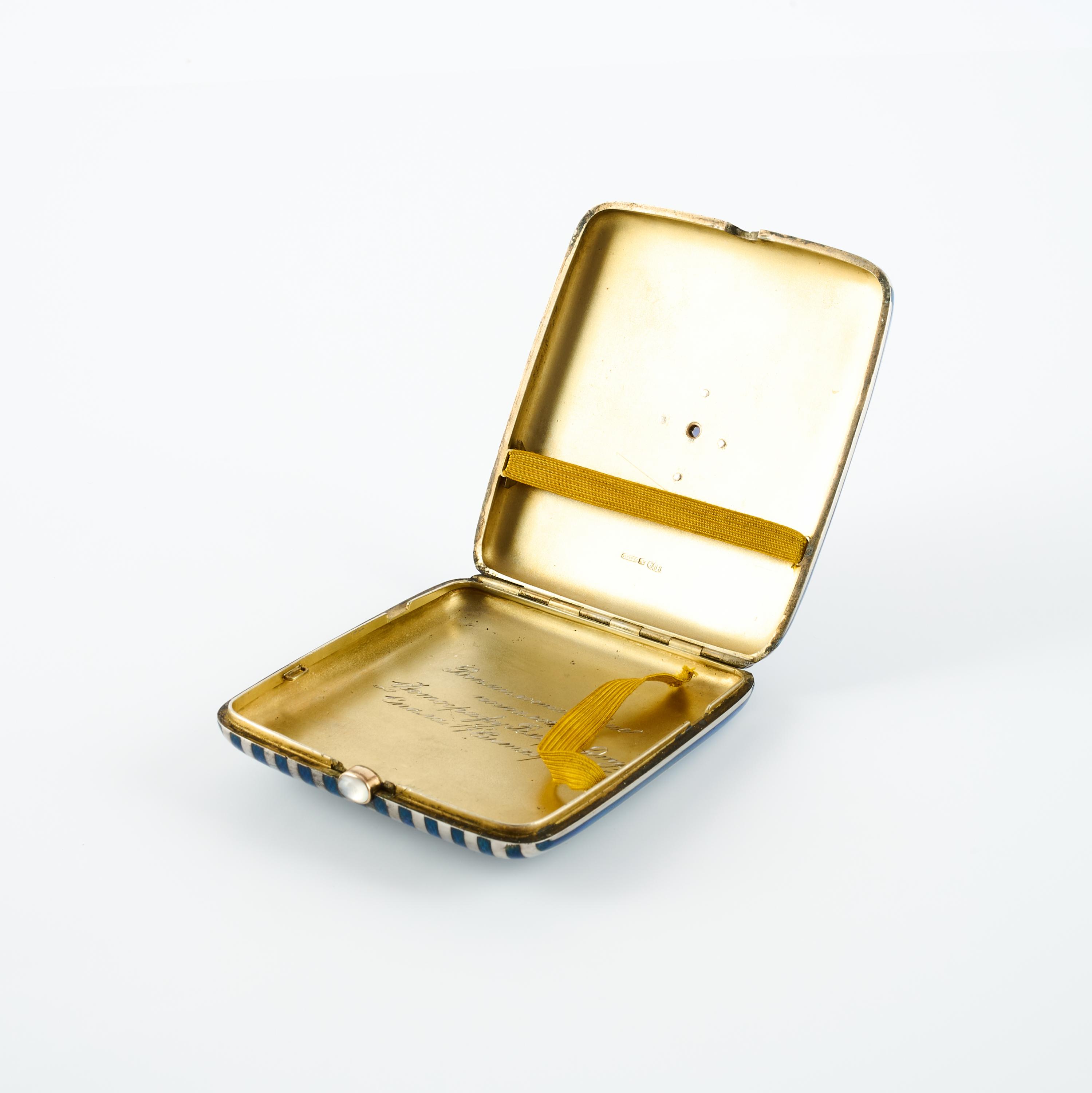 Emaildekor in Streifenform auf guillochiertem Grund. Auf der Oberseite der russische