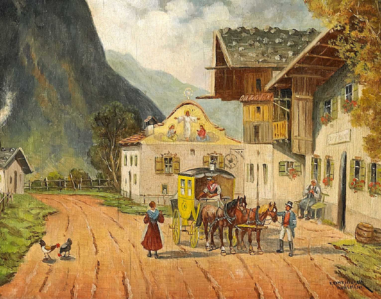 An der Poststation. Unten rechts: K. Rohrhirsch München. Öl auf Holz. 14 x 18,5cm. Rahmen.