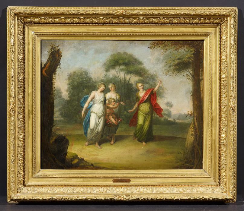 Amor und die drei Grazien. Öl auf Leinwand. Doubliert. 55,5 x 66cm. Vergoldeter Originalrahmen (?).