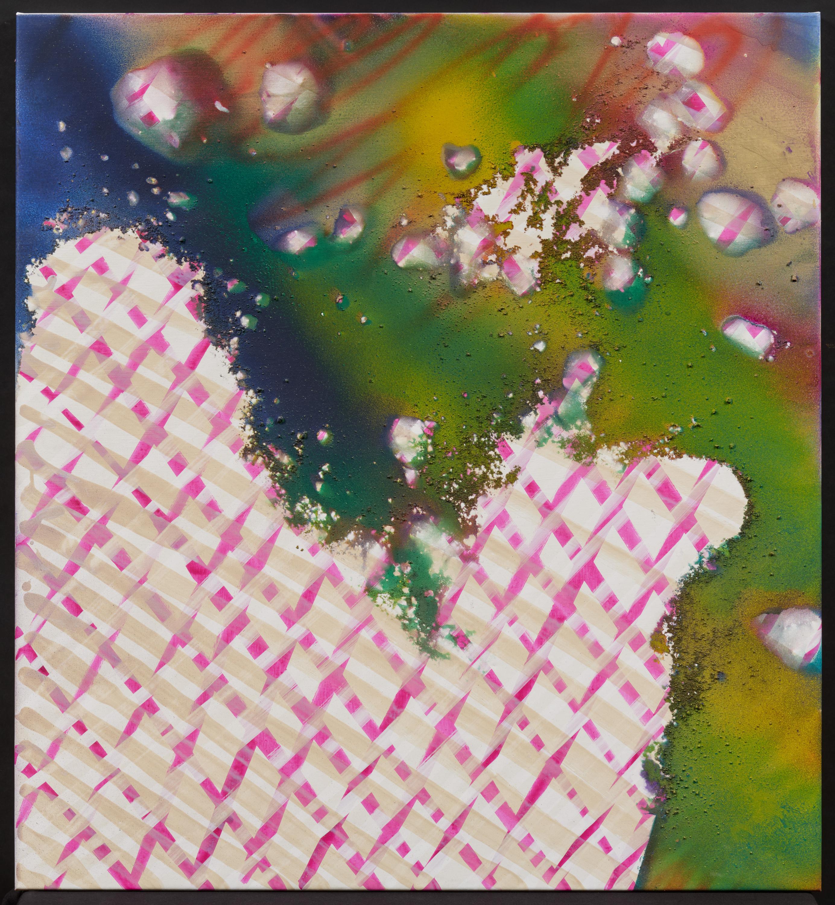 So auch in der unbetitelten Arbeit aus dem Jahr 2009, in der sie die Rezeption von Farbe als Medium hinterfragt. Mithilfe klarer, kraftvoller Farb- und Formkontraste wird Farbe selbst zum raumbeschreibenden und abbildenden Element. Der Hintergrund der Komposition wird von einem dynamischen Rautenmuster geprägt, das sich in vielschichtigen Nuancen zwischen Beige und Magenta horizontal über die Bildfläche legt. Diese feste Struktur tritt in ein spannungsvolles Verhältnis zur darübergelegten, organisch verlaufenden Farbfläche, die sich beinahe patinahaft über das geometrische Muster legt - nicht als glatte Übermalung, sondern in einer rhizomatischen Ausbreitung, die an Wachstumsprozesse erinnert: dezentral, organisch, unvorhersehbar. Neben dem Formkontrast aus Stringenz und Diffusität bestimmen auch die Gegensätze zwischen kühler und warmer Farbgebung sowie zwischen Fläche und Tiefe die aufgeladene visuelle Dynamik des Werks.