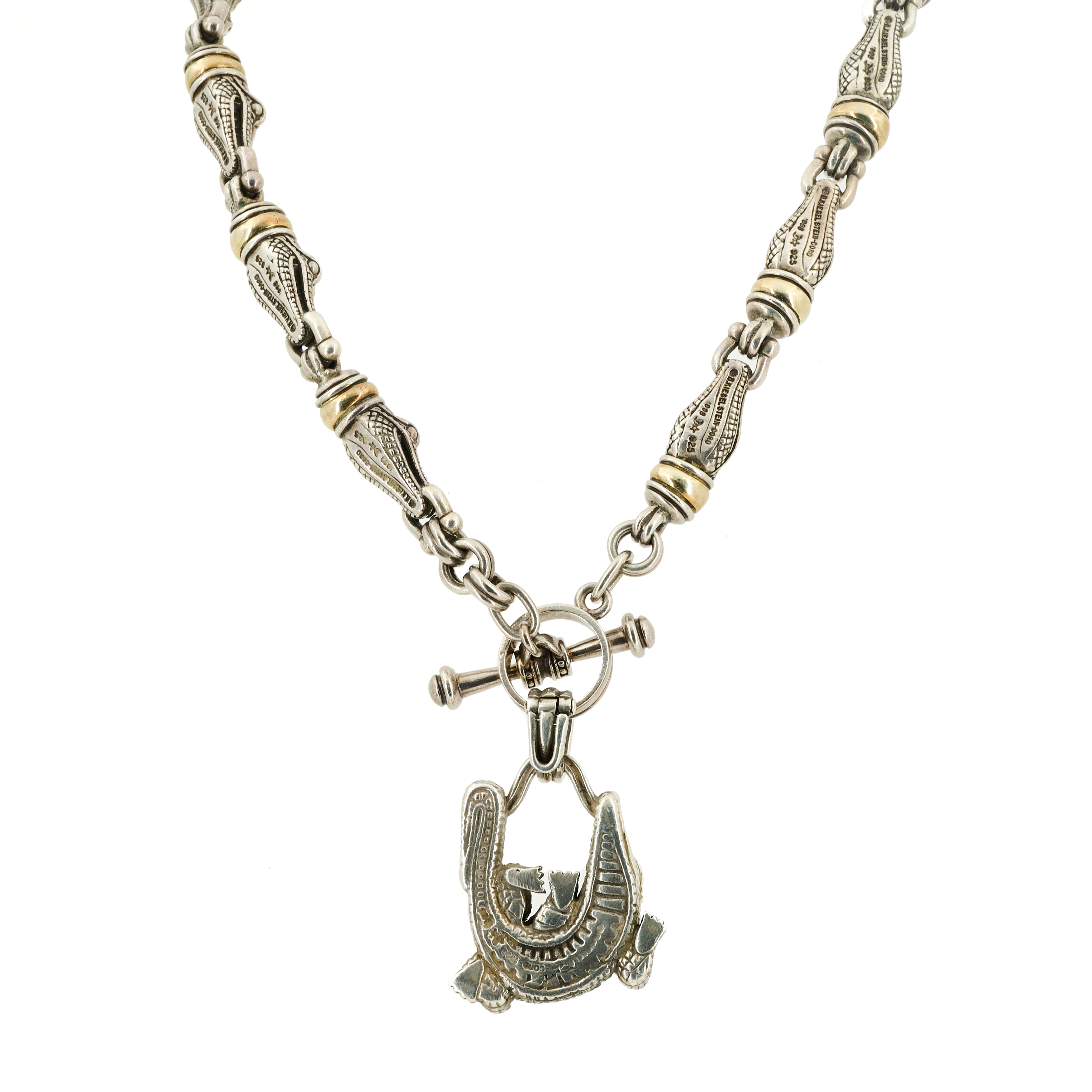 Beschreibung: Silber-Collier mit T-Verschluss, bestehend aus 12 Elementen in Form von Alligatorköpfen mit Gelbgold-Akzenten.