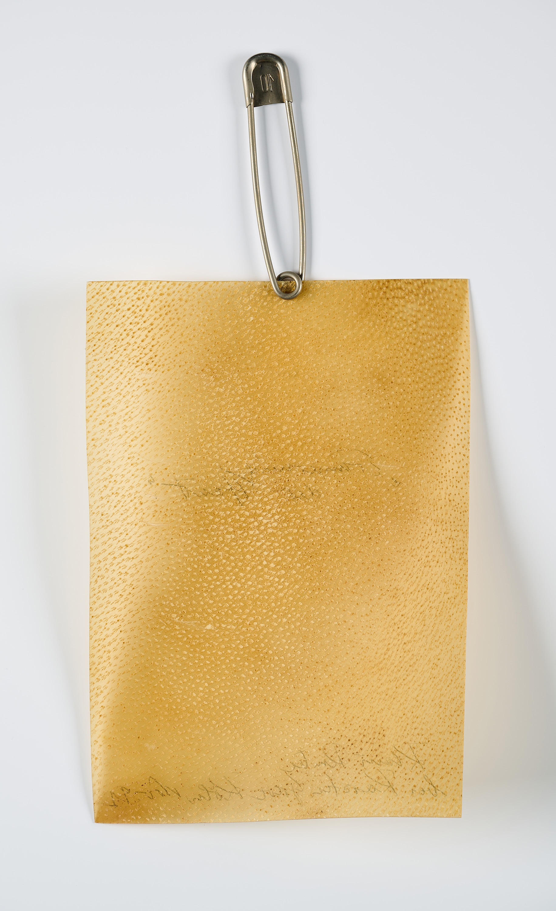 Technik: Pergament mit Sicherheitsnadel.