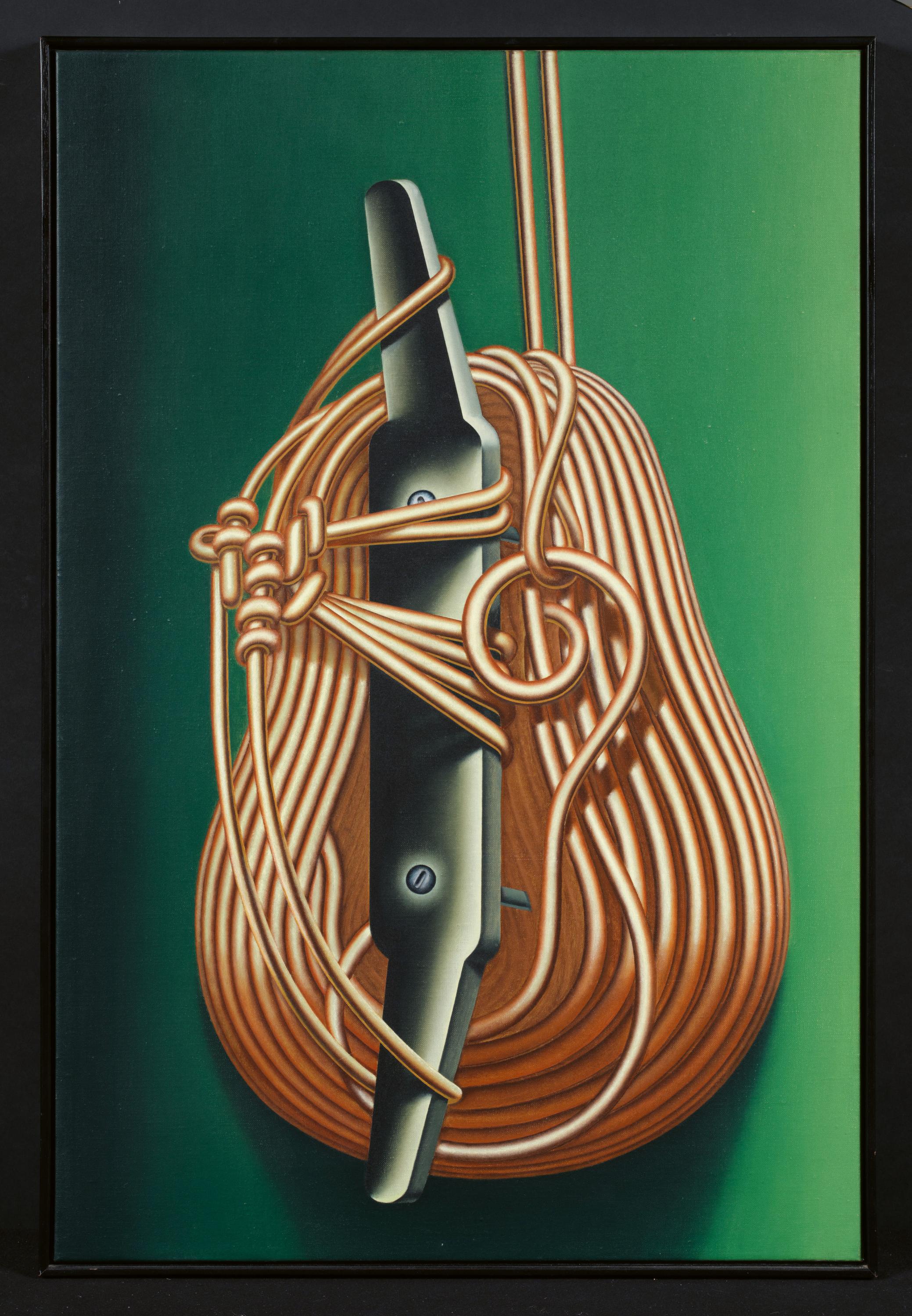 Das Motiv dieses 1987 entstandenen Gemäldes ist eine Ankerklampe mit einer vielfach gewundenen und verknoteten Schnur, die als komplexer, organisch wirkender Körper besonders reizvoll für den Maler war. Es existiert eine Variante aus demselben Jahr mit dem Titel "Die Probe" (Abb. 1) Im Katalog der Recklinghausener Ausstellung (Ausst.-Kat. Konrad Klapheck - Menschen und Maschinen, Kunsthalle Recklinghausen 2006) veröffentlichte der Künstler eine Schwarz-Weiß-Fotografie, die als Inspirationsquelle seiner Kompositionen diente (Abb.