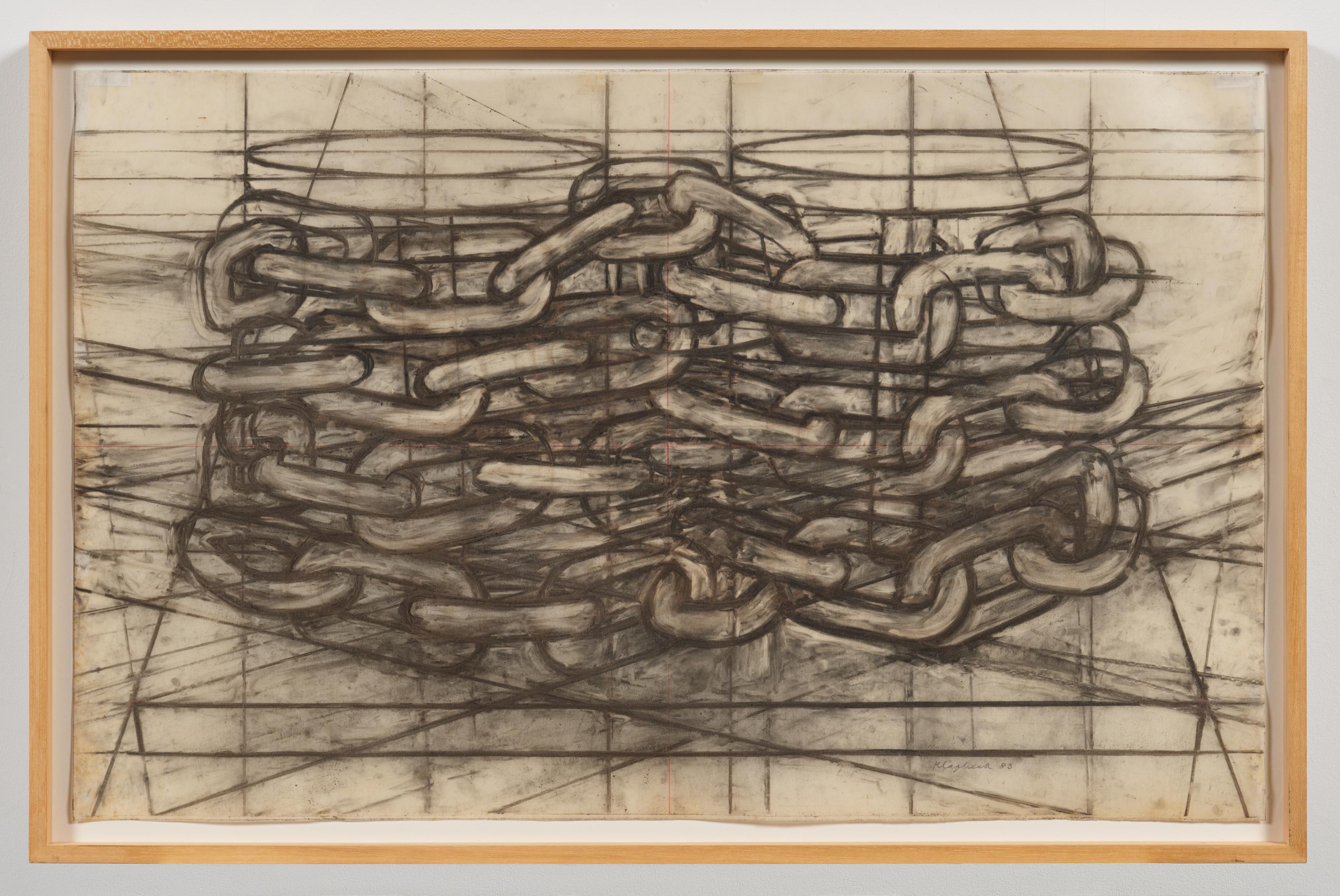Während die offenbar mühelos und perfekt ausgeführten Gemälde von Konrad Klapheck keine Arbeitsspuren aufweisen und wirken, als seien sie in den Worten des Künstlers "vom Himmel gefallen", sind die Vorzeichnungen voll davon. In dieser meisterhaften Zeichnung zum Gemälde "Bekenntnis" (1989, Hamburger Kunsthalle) ist der erhebliche Konstruktionsaufwand unmittelbar abzulesen, der für das Gemälde erforderlich war. Wie all seine Vorzeichnungen ist sie mit Graphit und Kohle auf Pergamentpapier ausgeführt, mit einem in Rotstift markierten Mittelkreuz, an dem sich die Komposition ausrichtet. Die Platzierung der Kettenglieder auf den beiden Pollern wurde mit zahlreichen Hilfslinien akribisch und nach festen Regeln erarbeitet - der große Reiz dieser Zeichnung liegt darin, der Arbeitsweise des Künstlers nachspüren zu können. Bestechend ist die Komplexität der Komposition, die in der Zeichnung ganz deutlich ist, während sie im Gemälde verdeckt und unauffällig wirkt.