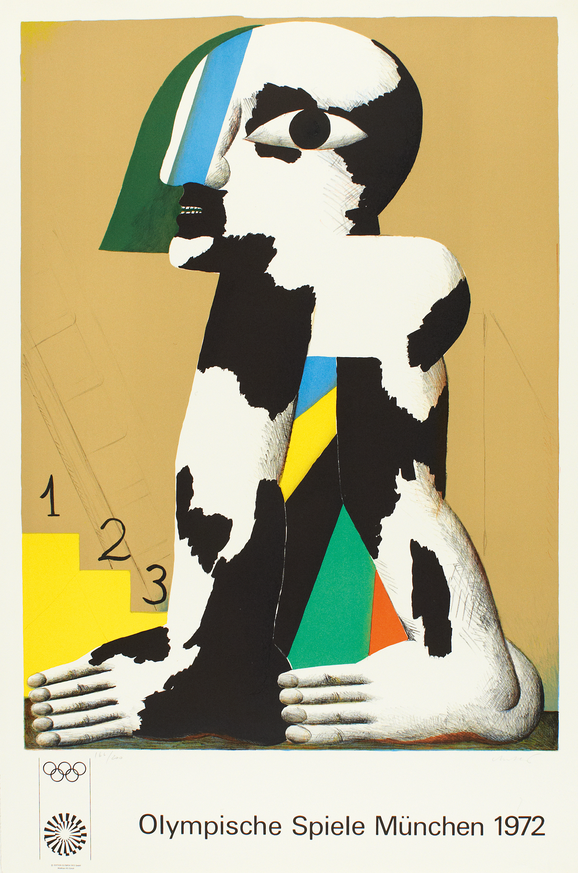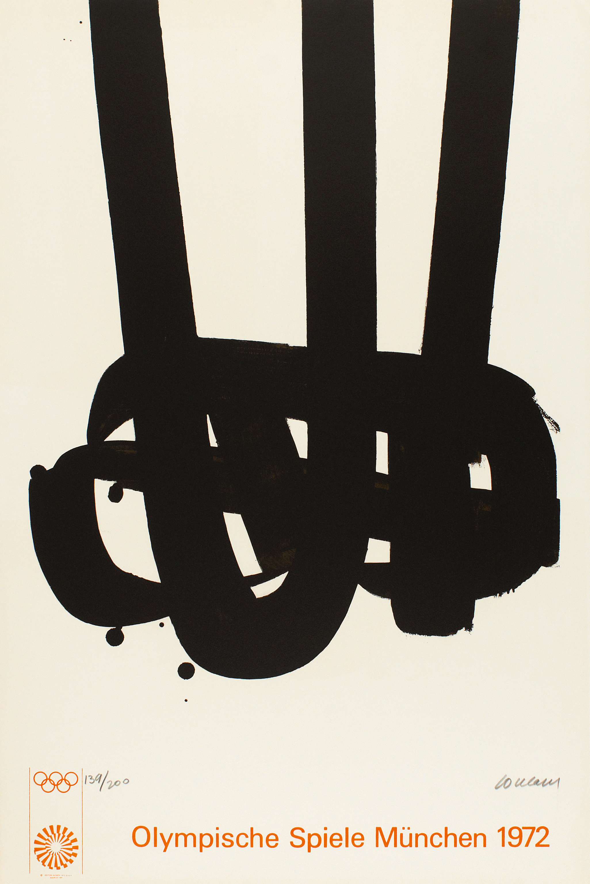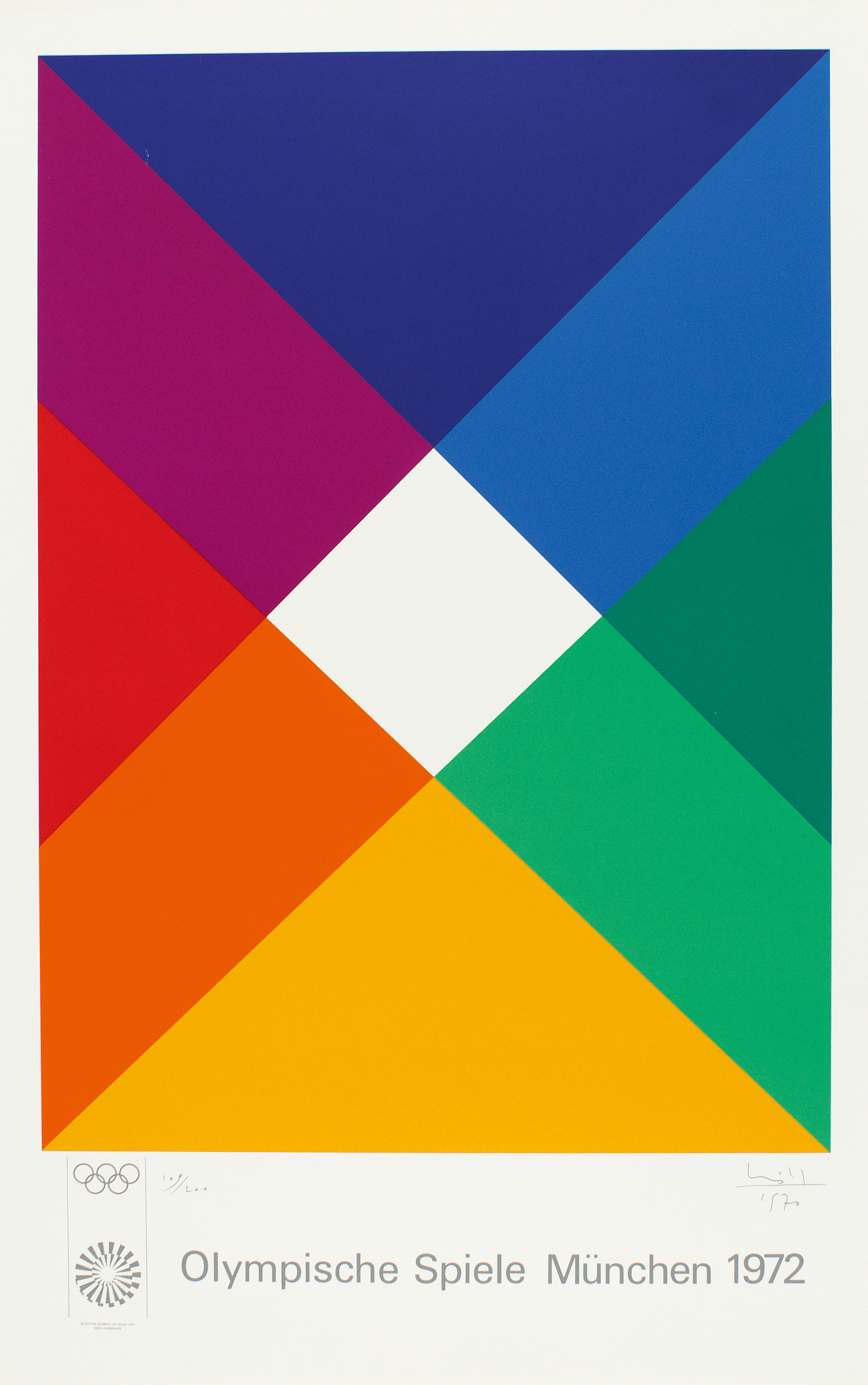 KonvolutOlympische Spiele. Konvolut von 17 Plakaten. U.a. von: Joseph Albers, Horst Antes, Max Bill, David Hockney, Friedensreich Hundertwasser, Serge Poliakoff, Pierre Soulage, Victor Vasarely (2), Tom Wesselmann. Originale Drucktechniken auf verschiedenen Papieren mit unterschiedlichen Formaten. Verschiedene Exemplar-Nrn aus der Auflage von 200 signierten und nummerierten Abzügen, teilweise datiert. Ausnahme Vasarely (unterschiedliche Motive): 1 signiertes, nicht nummeriertes Exemplar mit Texteindruck sowie 1 signiertes, nummeriertes Exemplar ohne Texteindruck. Edition Olympia 1972 GmbH und Bruckmann Verlag, München (Hrsg.).