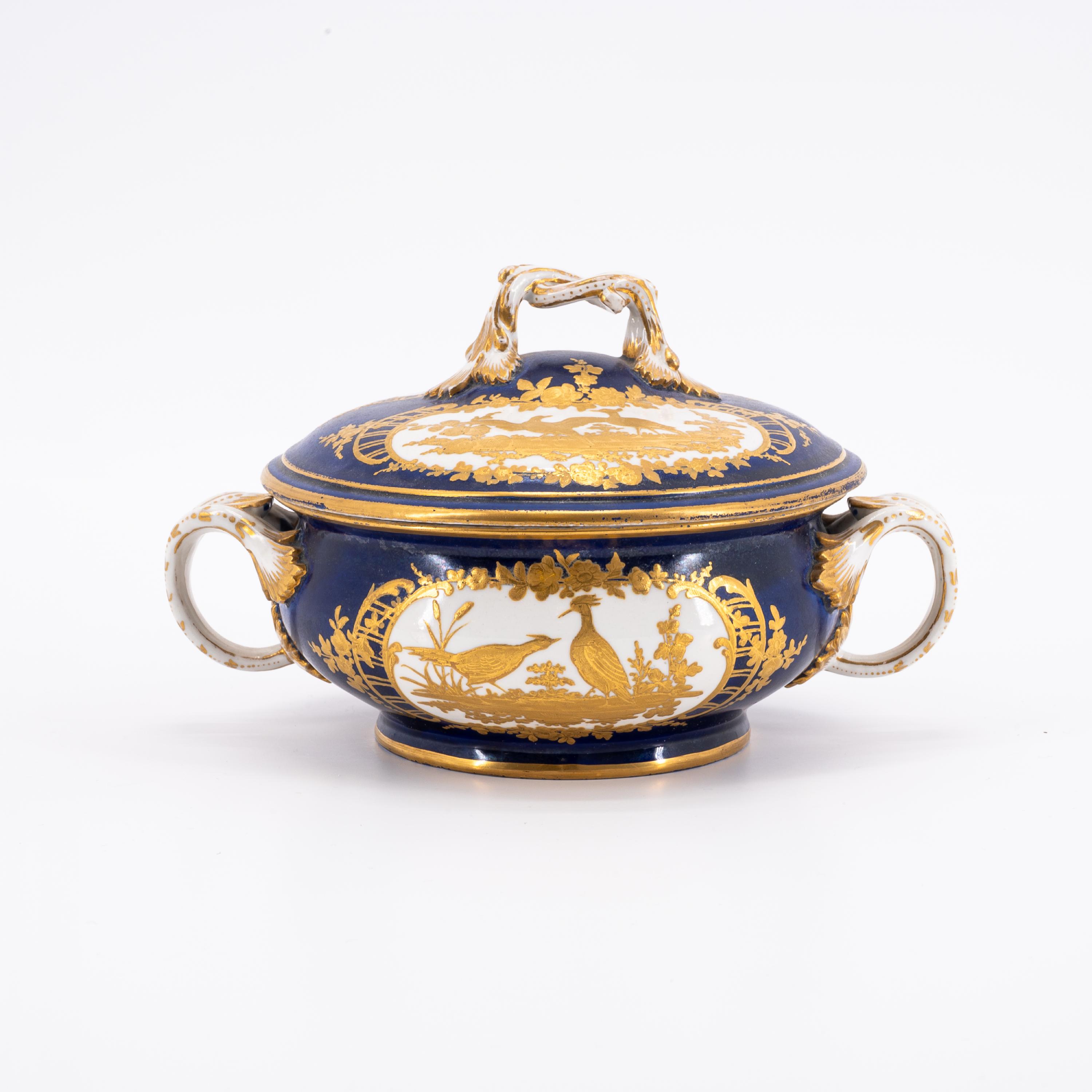 13 TASSEN MIT UNTERTASSEN, EIN PARFUMEI, EINE TERRINE, EINE SCHALE UND EIN STECKGEFÄß.