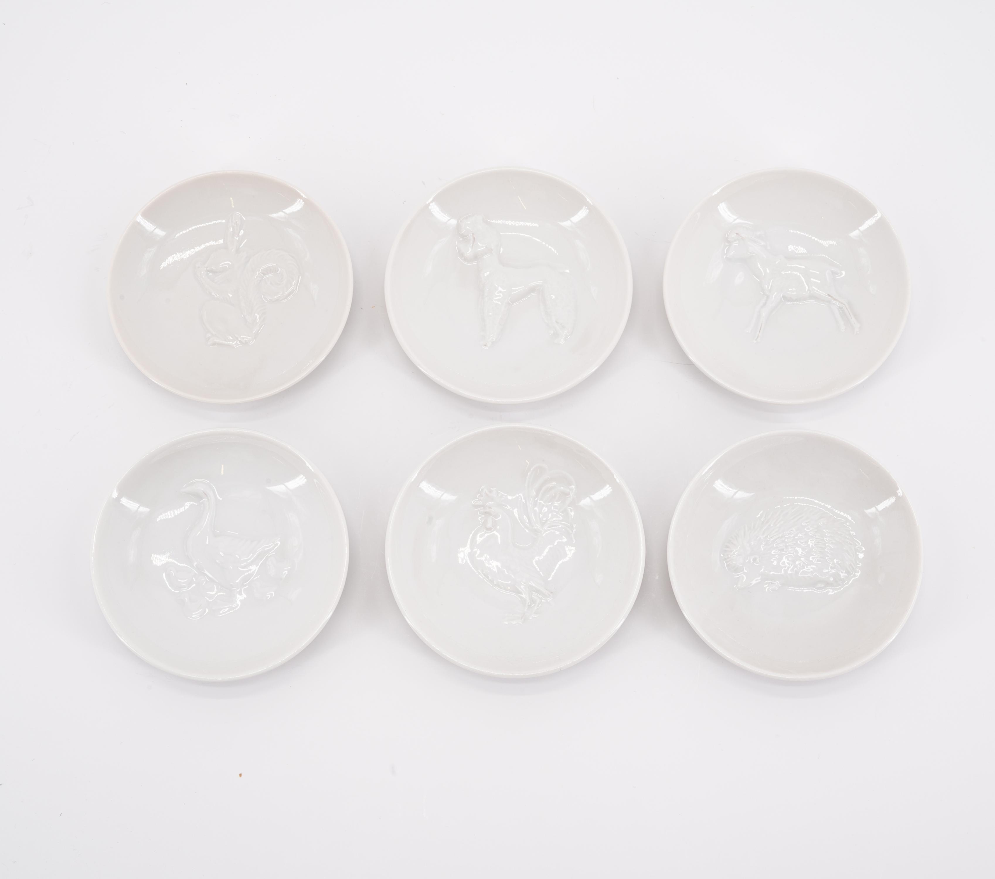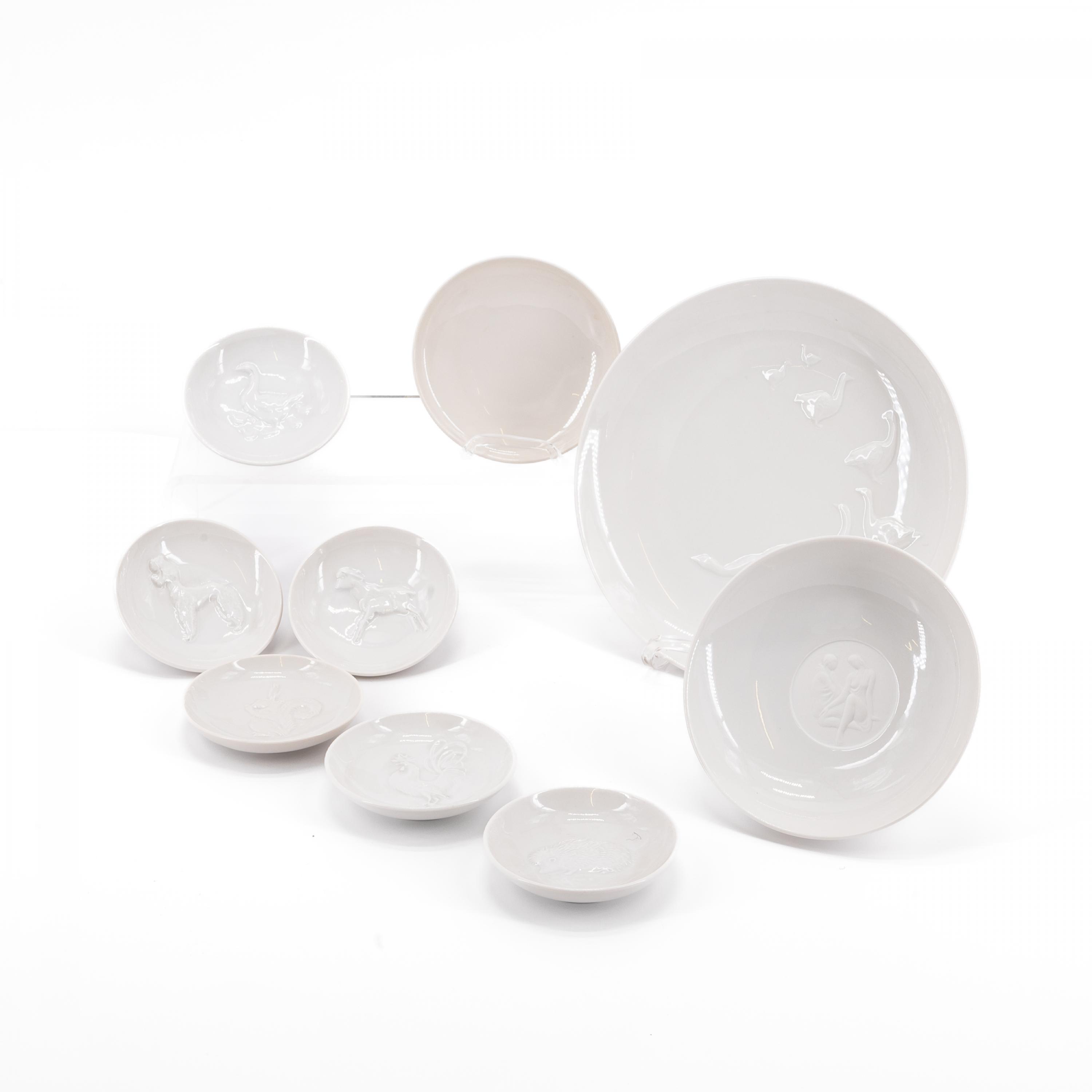 15 KLEINE TELLER MIT RELIEFIERTEN TIERMOTIVEN, 4 KLEINE TELLER, 1 GROßER TELLER MIT VOGELRELIEF.