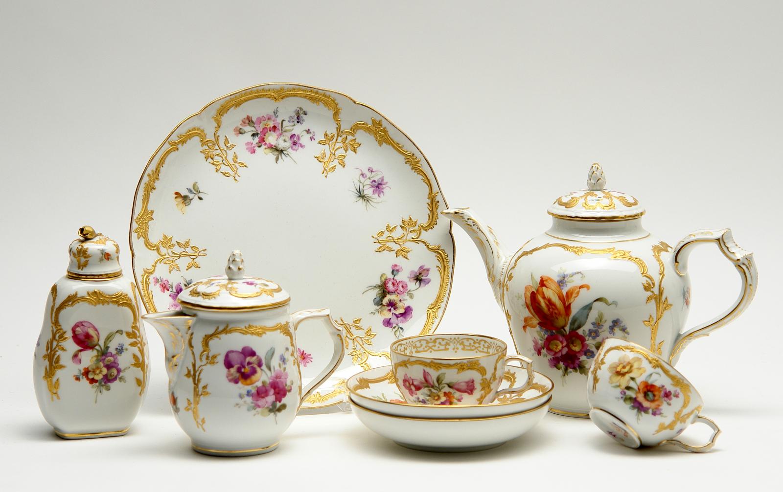 Porzellan, farbig staffiert. Goldrelief. Insgesamt acht Teile. Bestehend aus Teekanne, Milchkännchen, Zuckerdose, Teedose, zwei