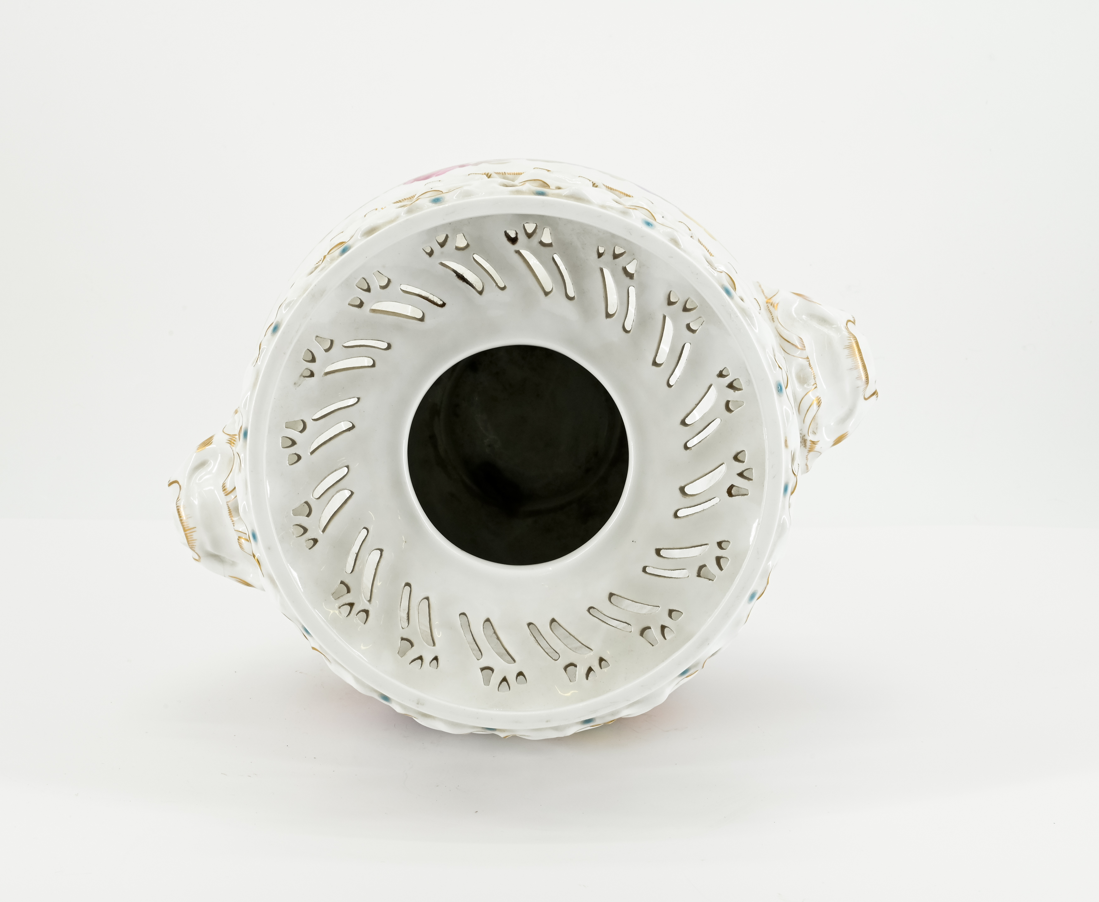 sowie der Fuß der Vase mit teilw. durchbrochenem Golddekor. Die Handhaben im Stil des