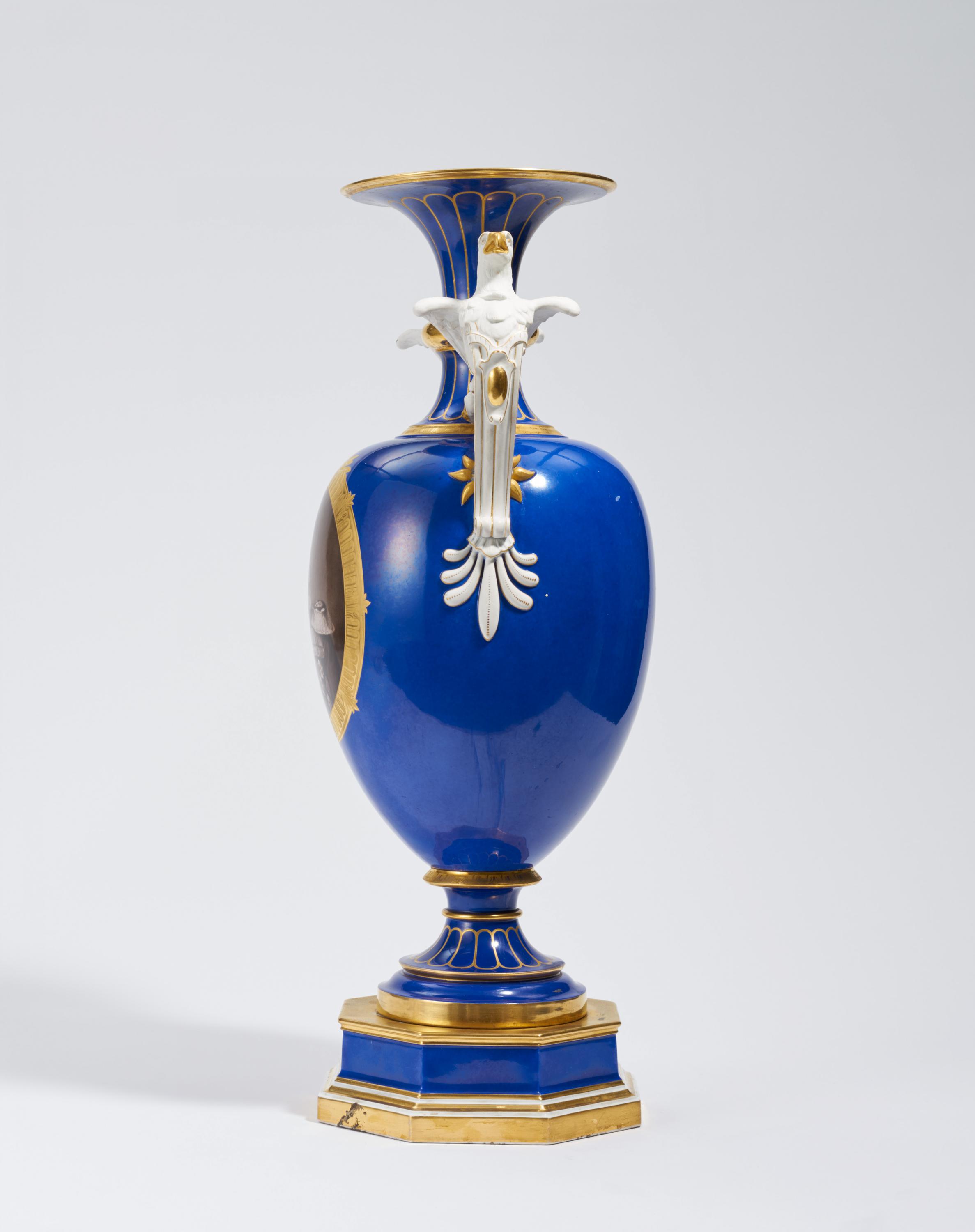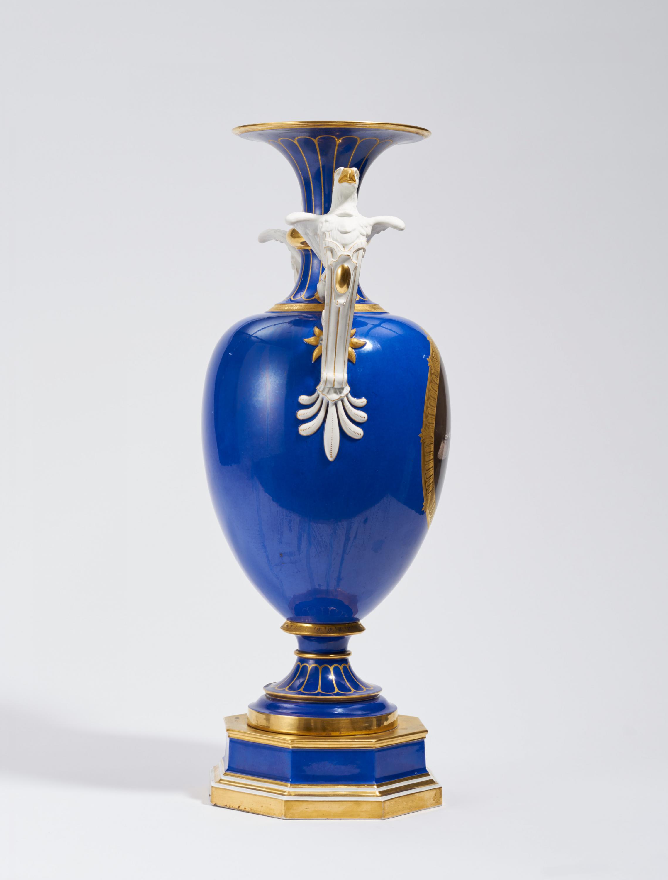achteckigem, getreppten Porzellansockel montiert. Schauseitig ovales Grisailleportrait