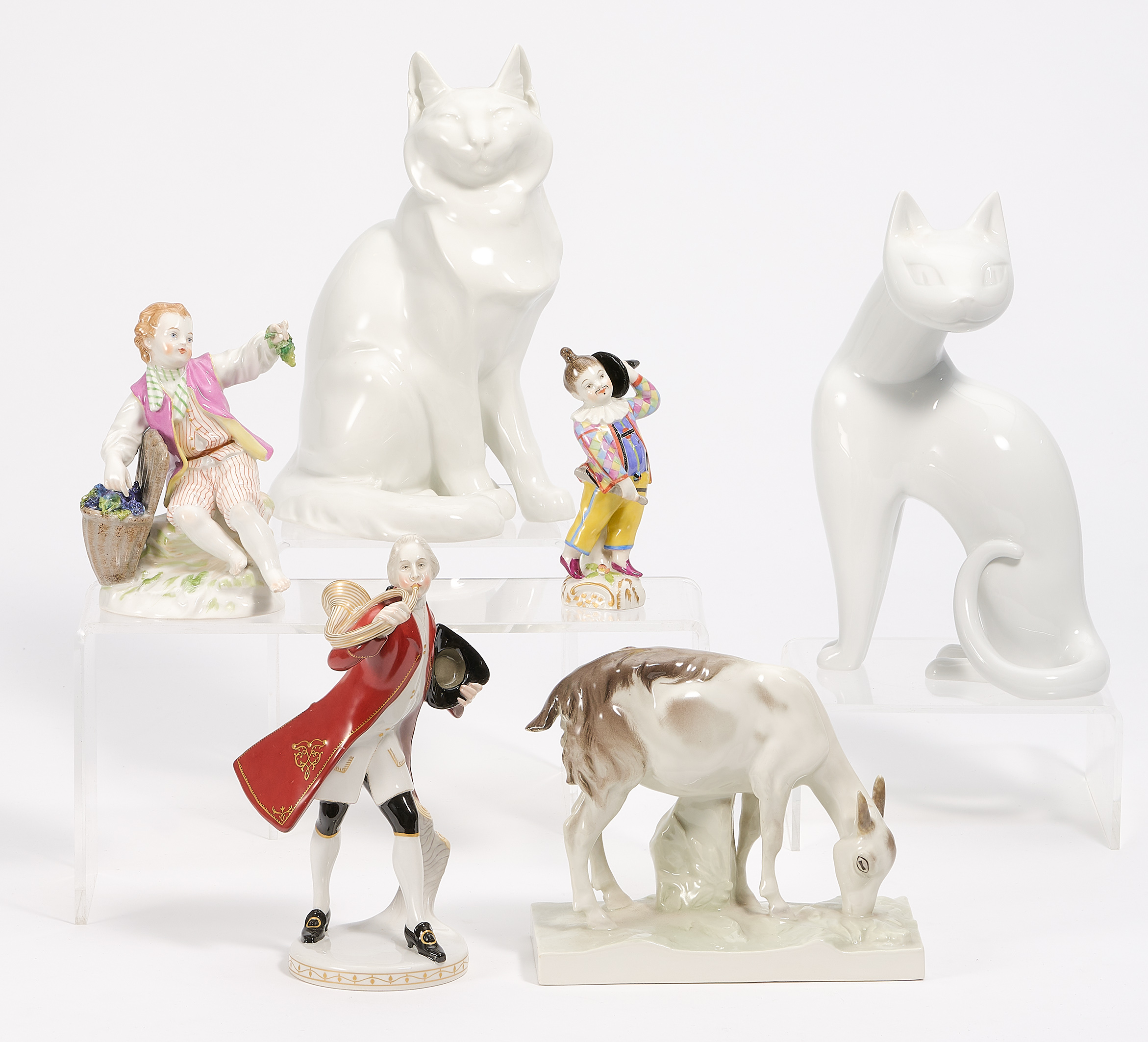 Beschreibung: 2 Katzenfiguren, 1 Ziege, 1 kleiner Harlekin, 1 Hornbläser, 1 Winzerjunge.