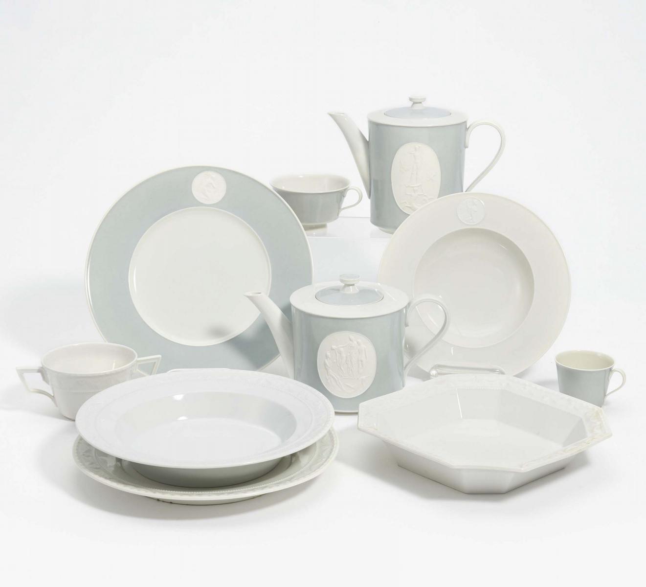 Technik: Porzellan mit Biskuitmedaillons, Kannen und div. Tellerränder mit graublauem Fond.