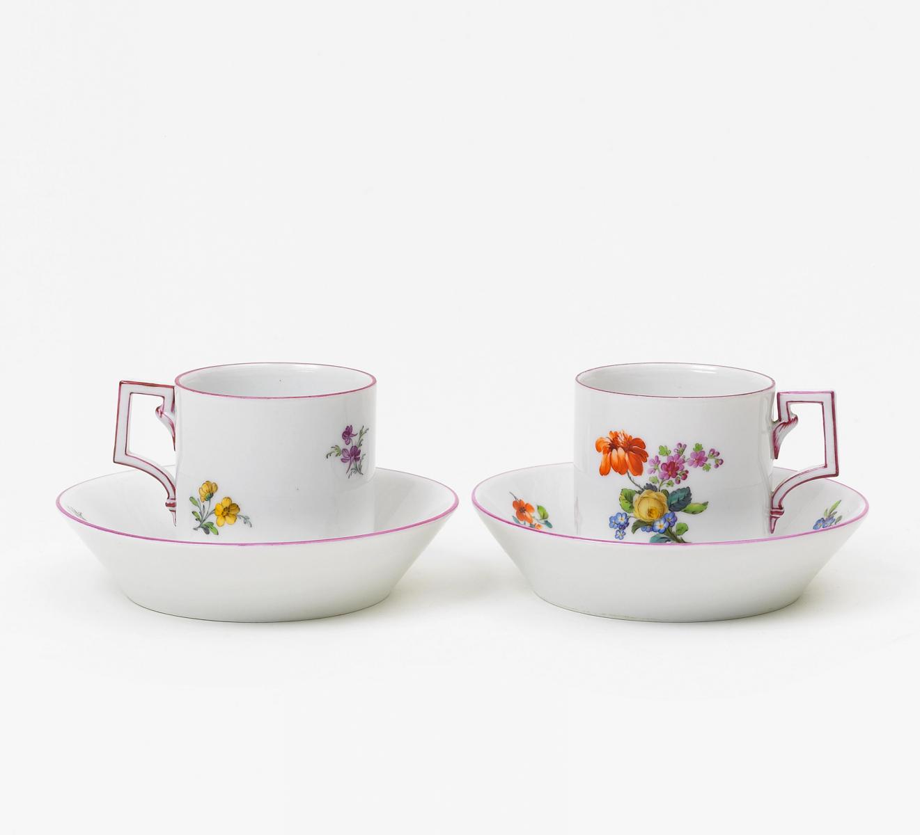 ZWEI TASSEN MIT UNTERTASSEN BLUMENDEKOR.