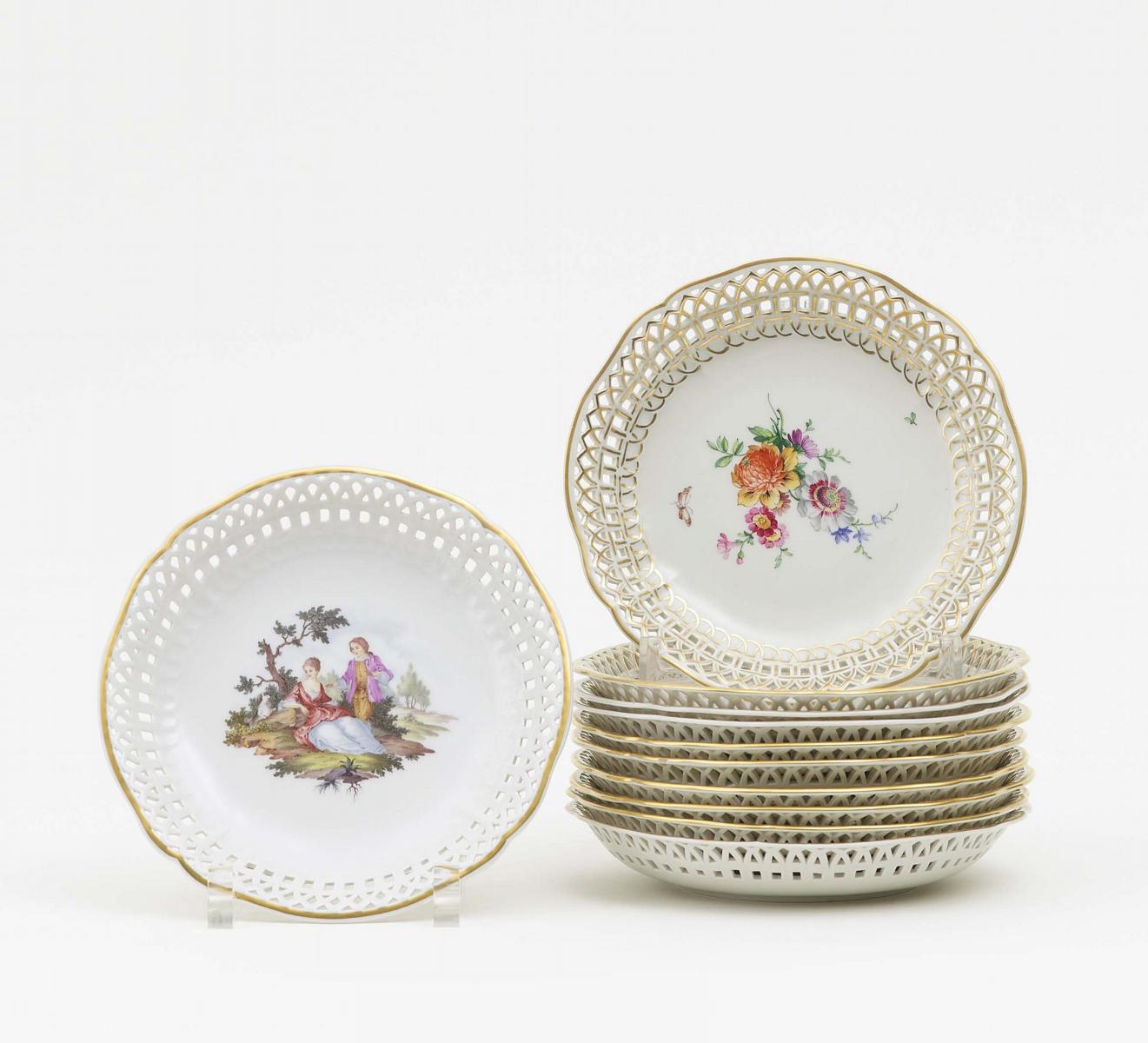 KONVOLUT 6 DESSERTTELLER MIT FRÜCHTEN, 4 DESSERTTELLER MIT BLUMEN, TELLER MIT PAAR.