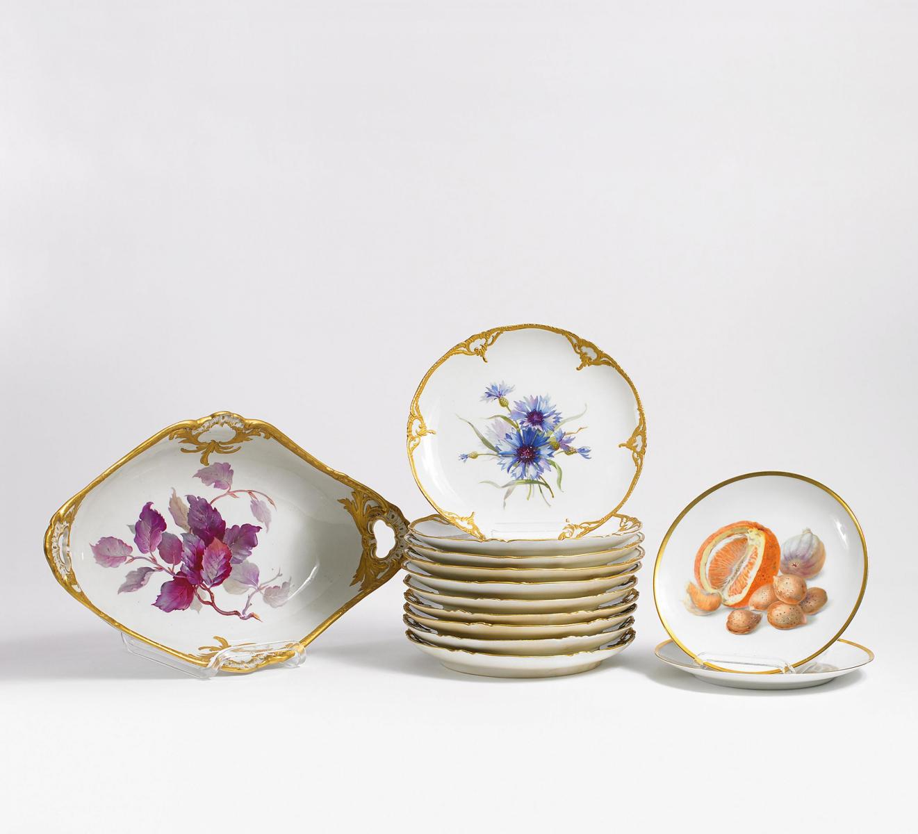 Zustand C. Beilage: 10 Kuchenteller mit Obst & Blumen, tlw. versch., 2 Teller mit Obst & Blumen Thomas Bavaria.