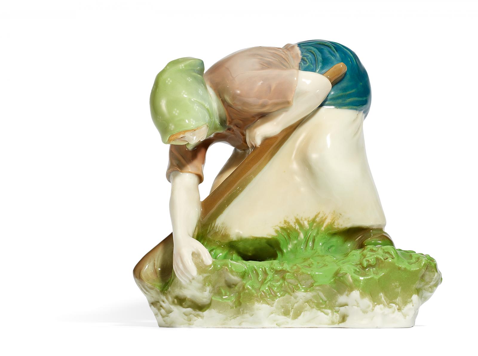 Auf Natursockel gebückt stehende Bäuerin mit Gartengerät in der Hand. Höhe 21,5 cm.