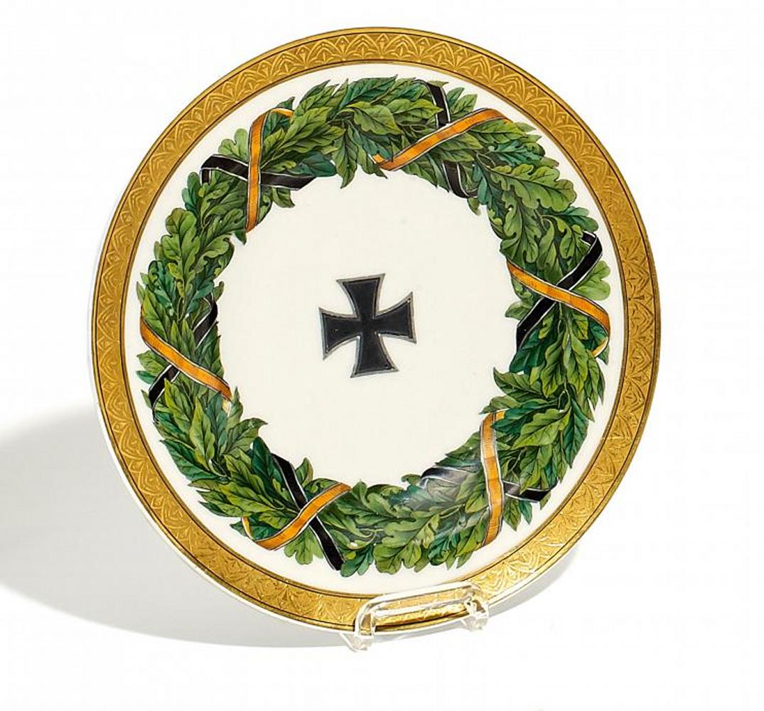 Porzellan, farbig und gold staffiert. Antikglatt. In Spiegelmitte Kriegskreuz. ø 24,5 cm.