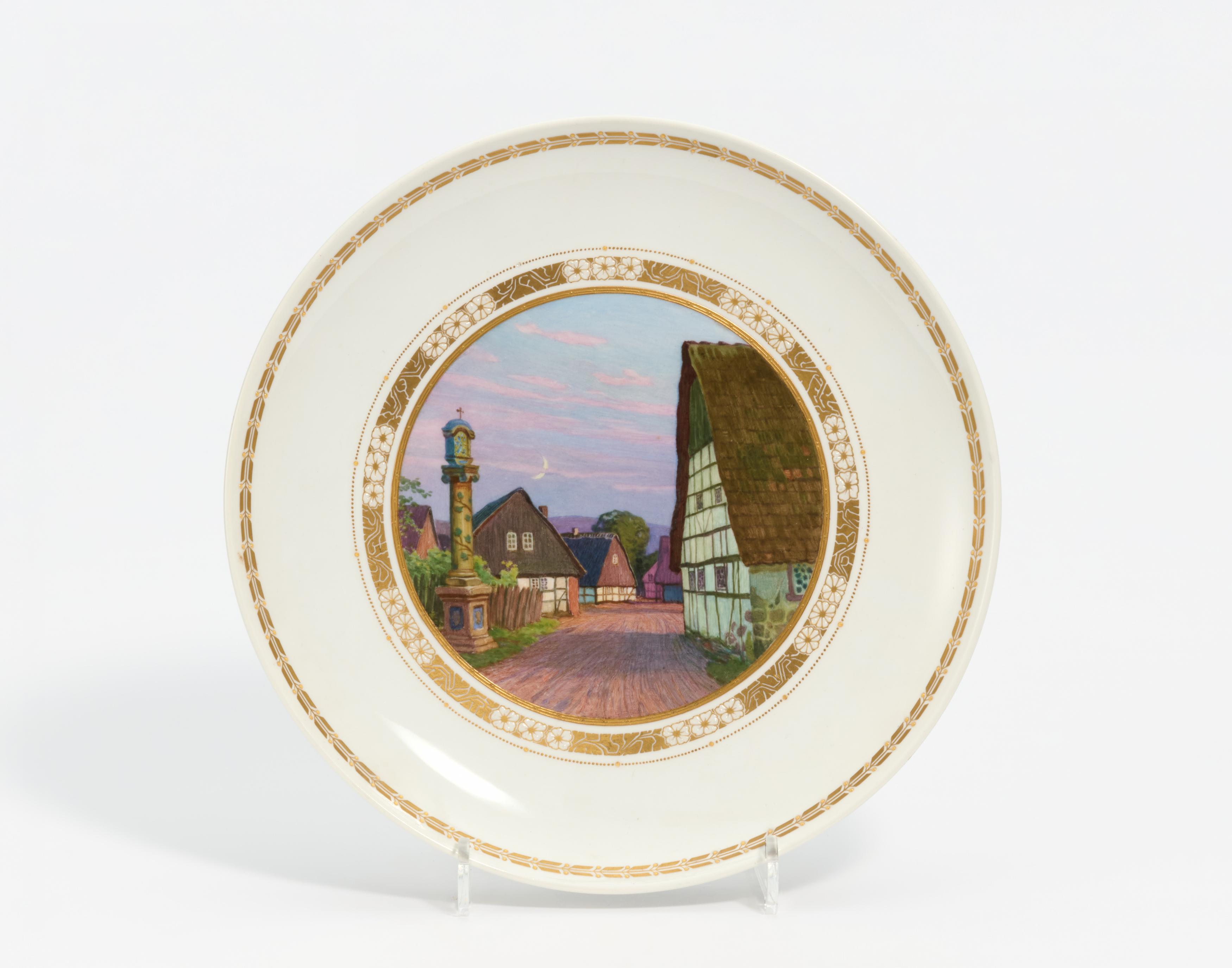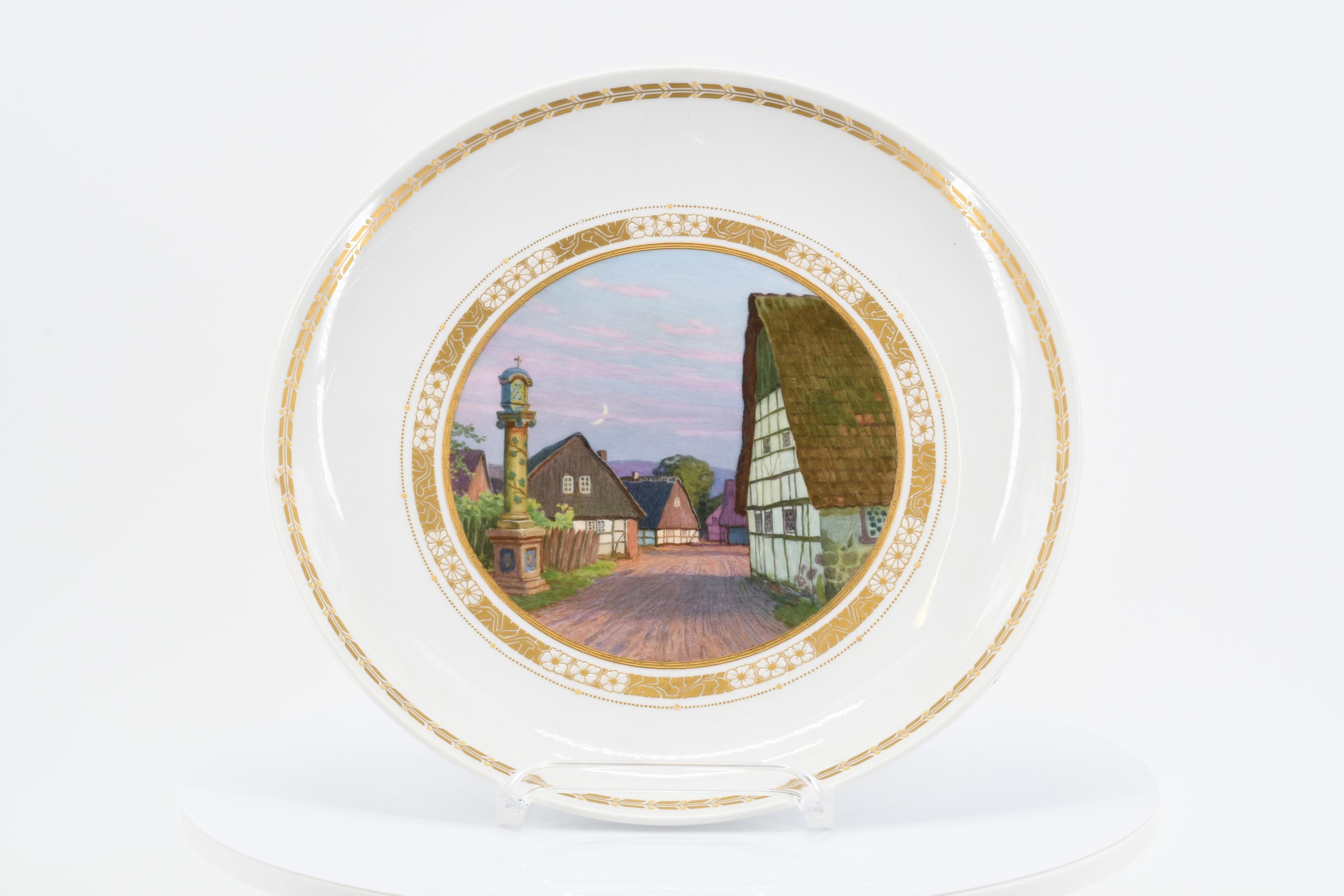 TELLER MIT DORFANSICHT UND GOLDEMAILDEKOR.