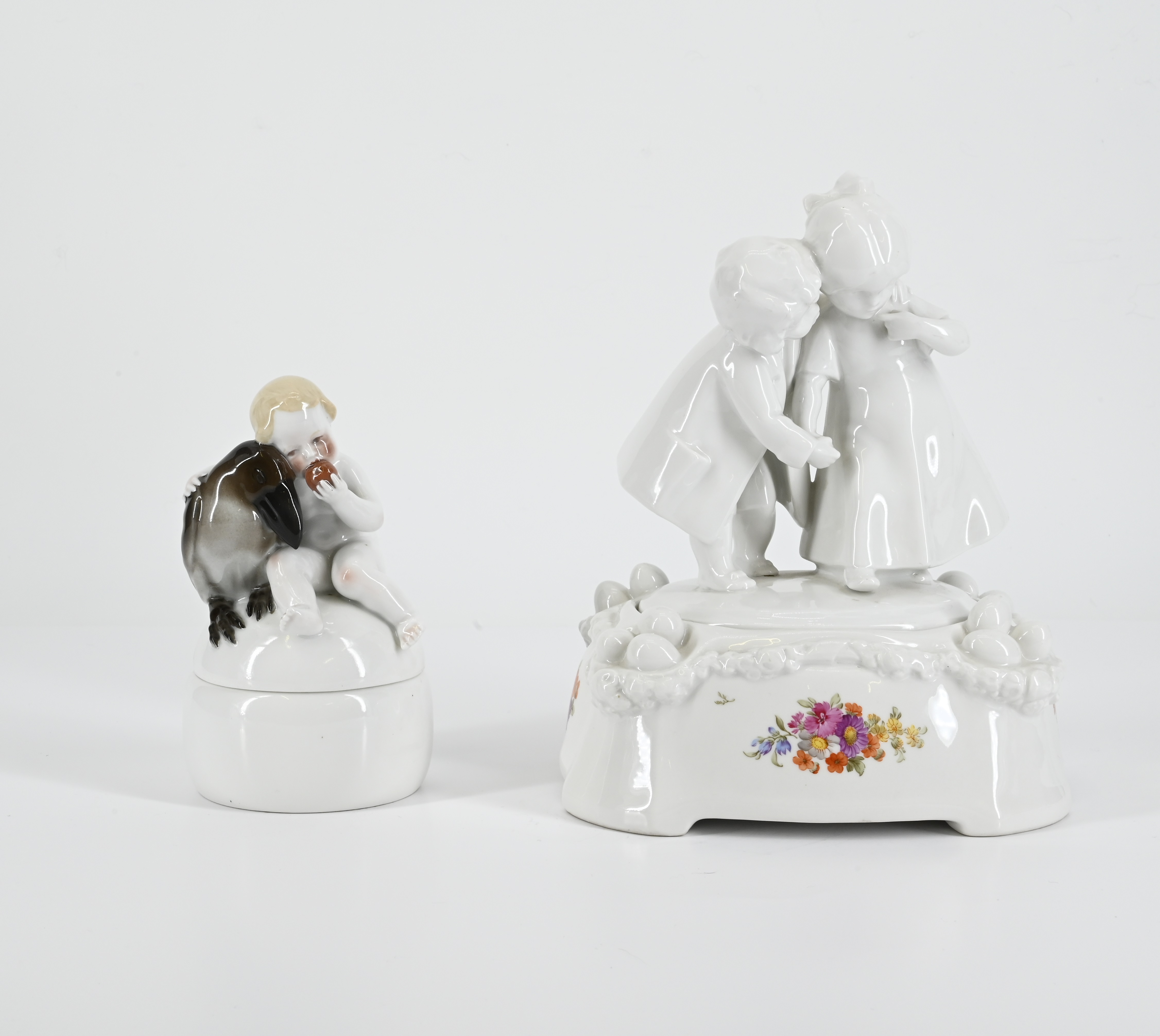 ZWEI DOSEN MIT KINDERFIGUREN UND SPREEWÄLDER KIND MIT SCHIRM.