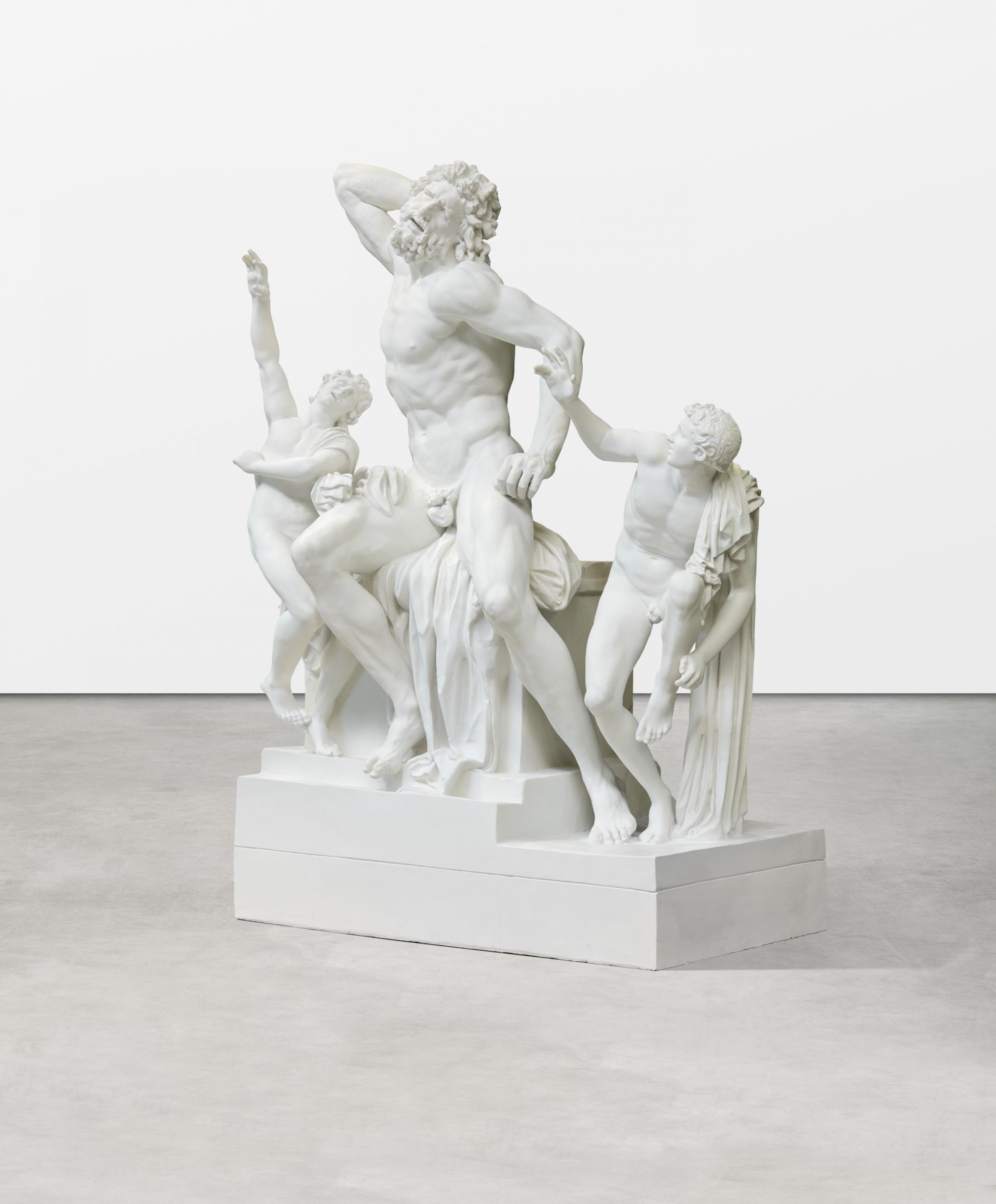 Der Priester Laokoon, einer der bekanntesten Protagonisten der griechischen Mythologie, warnte seine Mitbürger davor, das hölzerne Pferd als Geschenk der Griechen in die Stadt Troja zu bringen. Nachdem Poseidon Laokoon und seine Söhne durch zwei Seeschlangen ermorden ließ, blieb seine Warnung missachtet und Troja erlag den Griechen. Kris Martin zitiert mit seiner Skulptur "Mandi VIII" eine der bedeutendsten Ikonen der Kunstgeschichte, denn er realisierte einen maßstabsgetreuen Gipsabguss der Laokoon-Gruppe von Hagesandros, Polydoros und Athanadoros, die sich heute in den Vatikanischen Museen befindet. Das Original in Marmor zeigt den Augenblick, in dem Laokoon und seine Söhne im Kampf mit den Schlangen um den Tod ringen. Martins Laokoon kämpft allerdings mit dem Nichts: die Schlangen fehlen in der sonst akribisch getreuen Nachbildung.