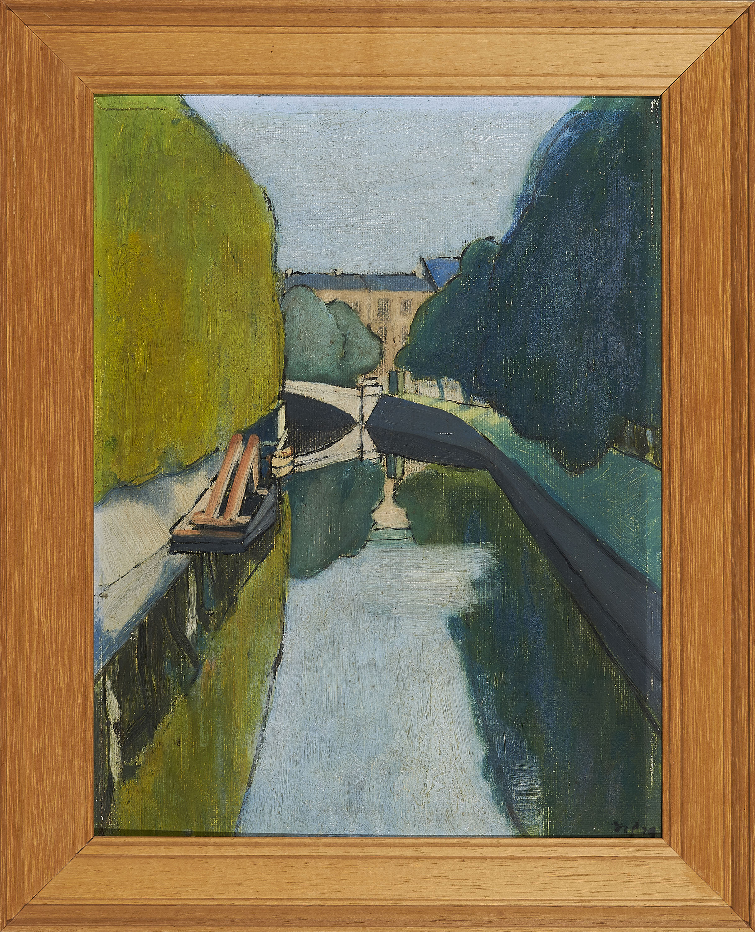 Bezeichnung: Monogrammiert und datiert unten rechts: KS 29. Sowie verso unleserlich bezeichnet. Darunter betitelt und datiert: "Landschaftskanal" 1929.