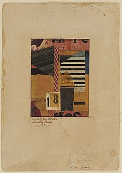 Schwitterts widmet unsere kleine, 1921 entstandene Collage Johannes Molzahn. Beide lernen sich spätestens 1919 kennen, als sie gemeinsam in der Berliner Galerie Sturm ausstellen. Nicht nur die progressiven Kunstgedanken verbindet sie. So arbeiten beide als Schrift- und Reklamegestalter, um ihren Lebensunterhalt zu bestreiten. Auch hier gehen sie ähnliche Wege, denn für sie hat die Gebrauchskunst keinen geringeren Stellenwert als die hohen Künste. Ihre neuartigen Gedanken verfassen sie in theoretischen Schriften, mit denen sie einen wichtigen Beitrag zur Weiterentwicklung von Typografie und Werbegrafik nicht nur in Deutschland leisten. Wie begeistert Schwitters von seinem Kollegen ist, zeigt, dass er für diesen das Gedicht "An Johannes Molzahn", schreibt und es 1919 in seinem Büchlein "Anna Blume" veröffentlicht (Gedicht 37). Die Künstler pflegen in den folgenden Jahren einen engen Kontakt, wie auch die Postkarte von Schwitters an Molzahn vom 14. Oktober 1921 belegt (siehe Los 11).