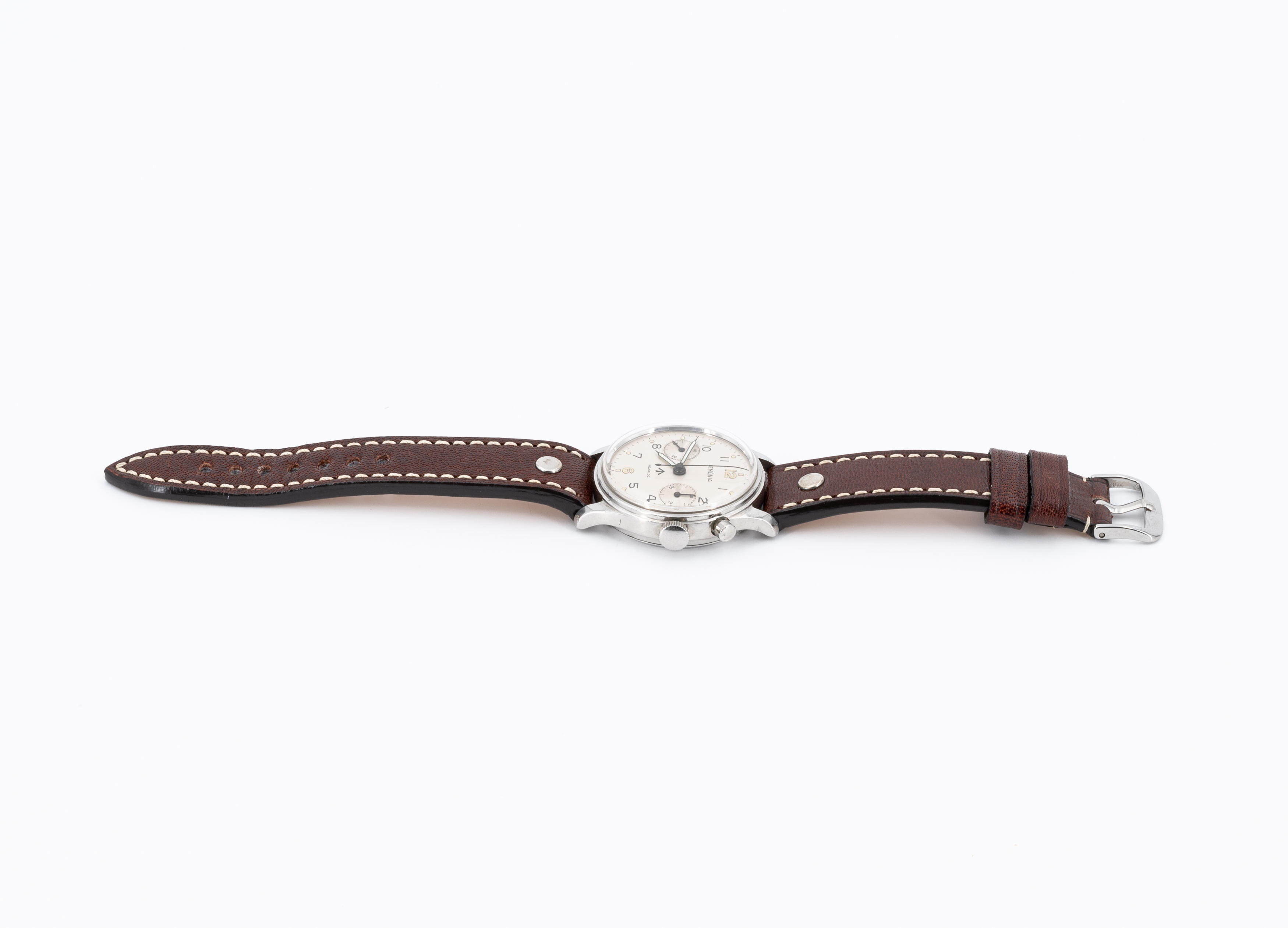 Beschreibung: 3-Zeiger-Chronograph mit 30-Minutenzähler bei "3" Uhr und dezentraler Sekunde bei "9" Uhr.