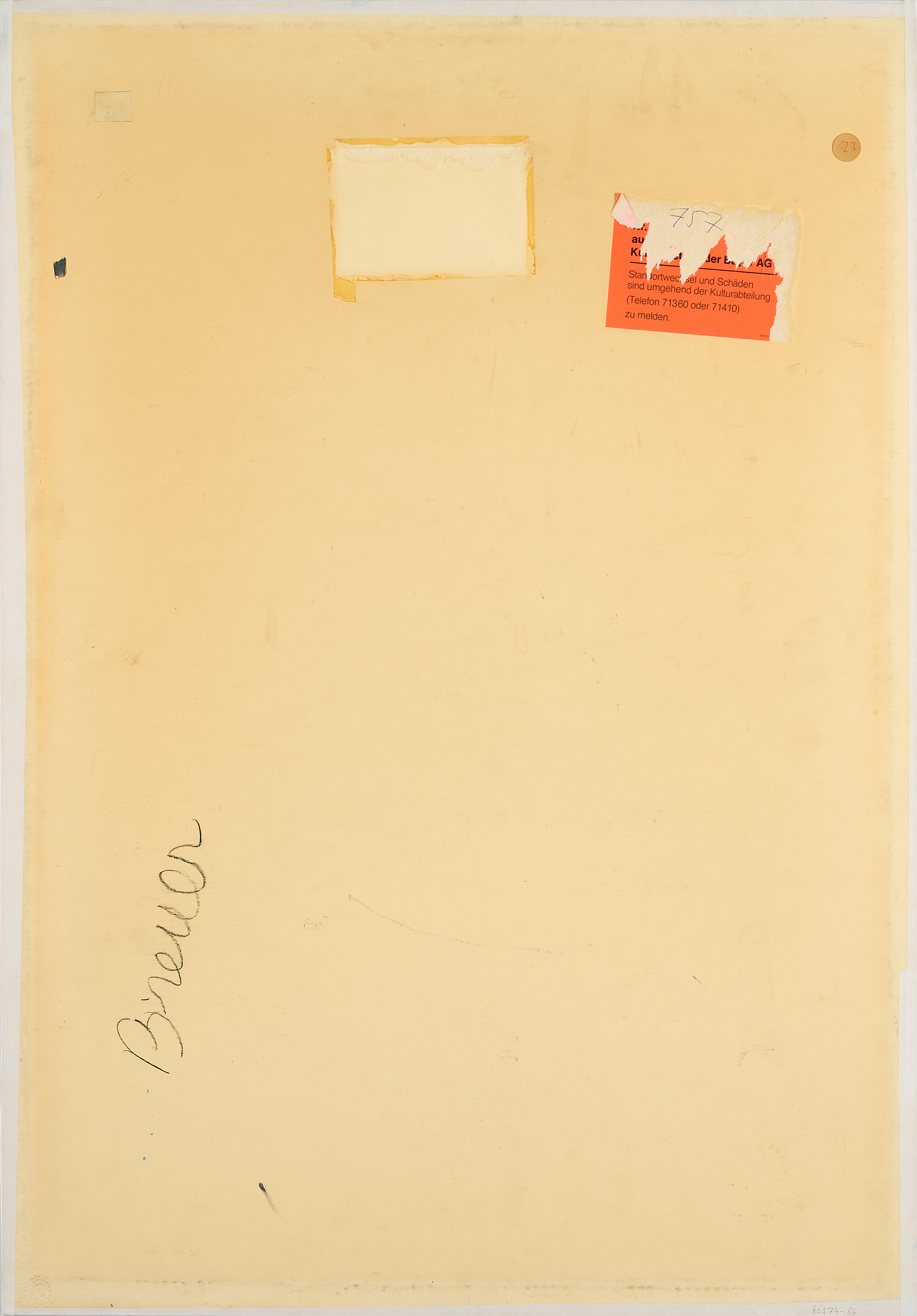 Leichte Bereibungen an den Rändern, partiell mit kleinen Farbverlusten (wohl von ehemaliger Rahmung) (max. ca. 0,4 x 0,4cm). Möglicherweise Farben minimal verblasst (?). Verso umlaufend Reste alter Montierung sowie leichte Verschmutzungen. Ansonsten guter Zustand.