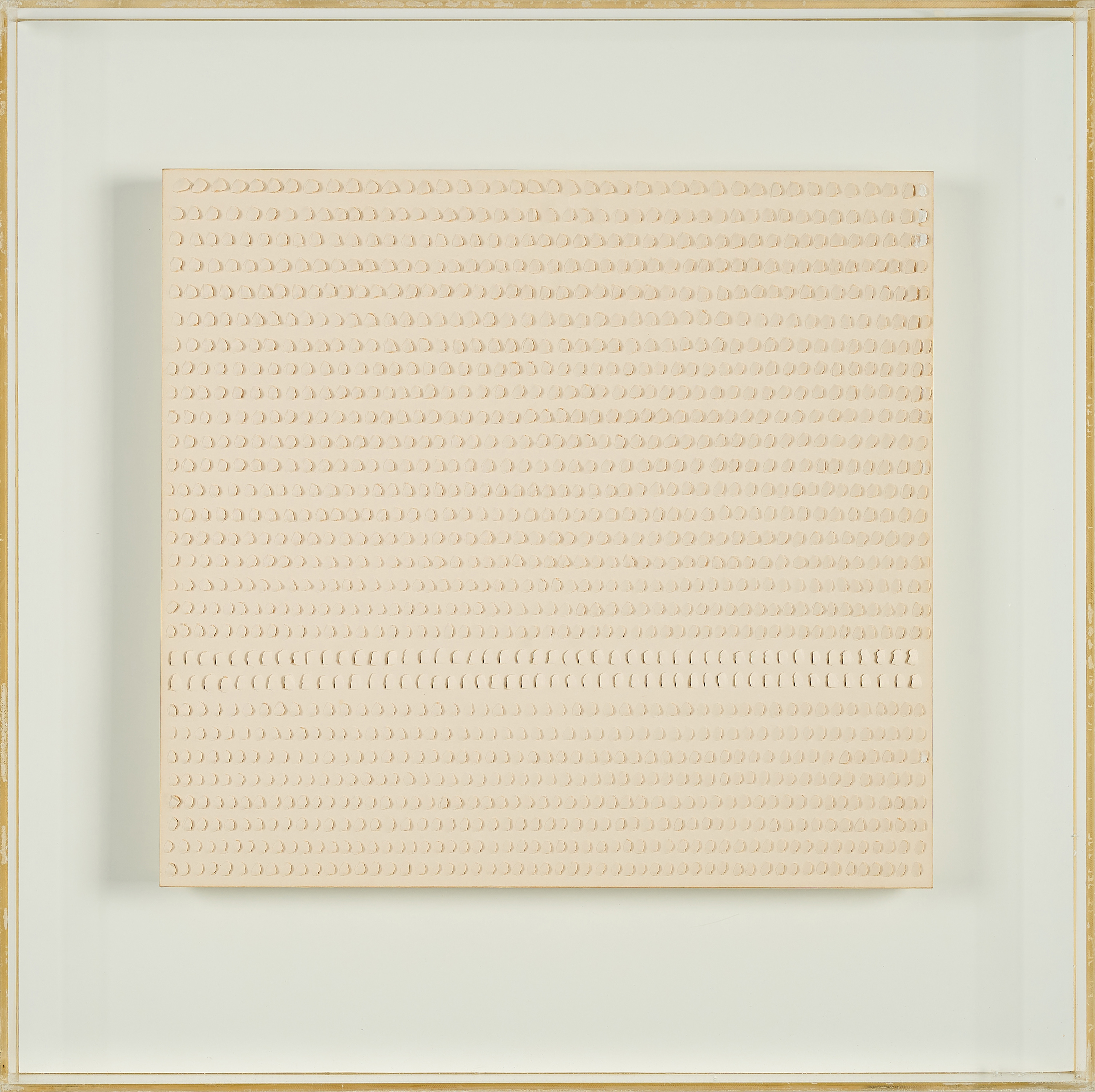Technik: Eingerissenes Papier über Holzplatte. In Plexiglaskastenrahmen.
