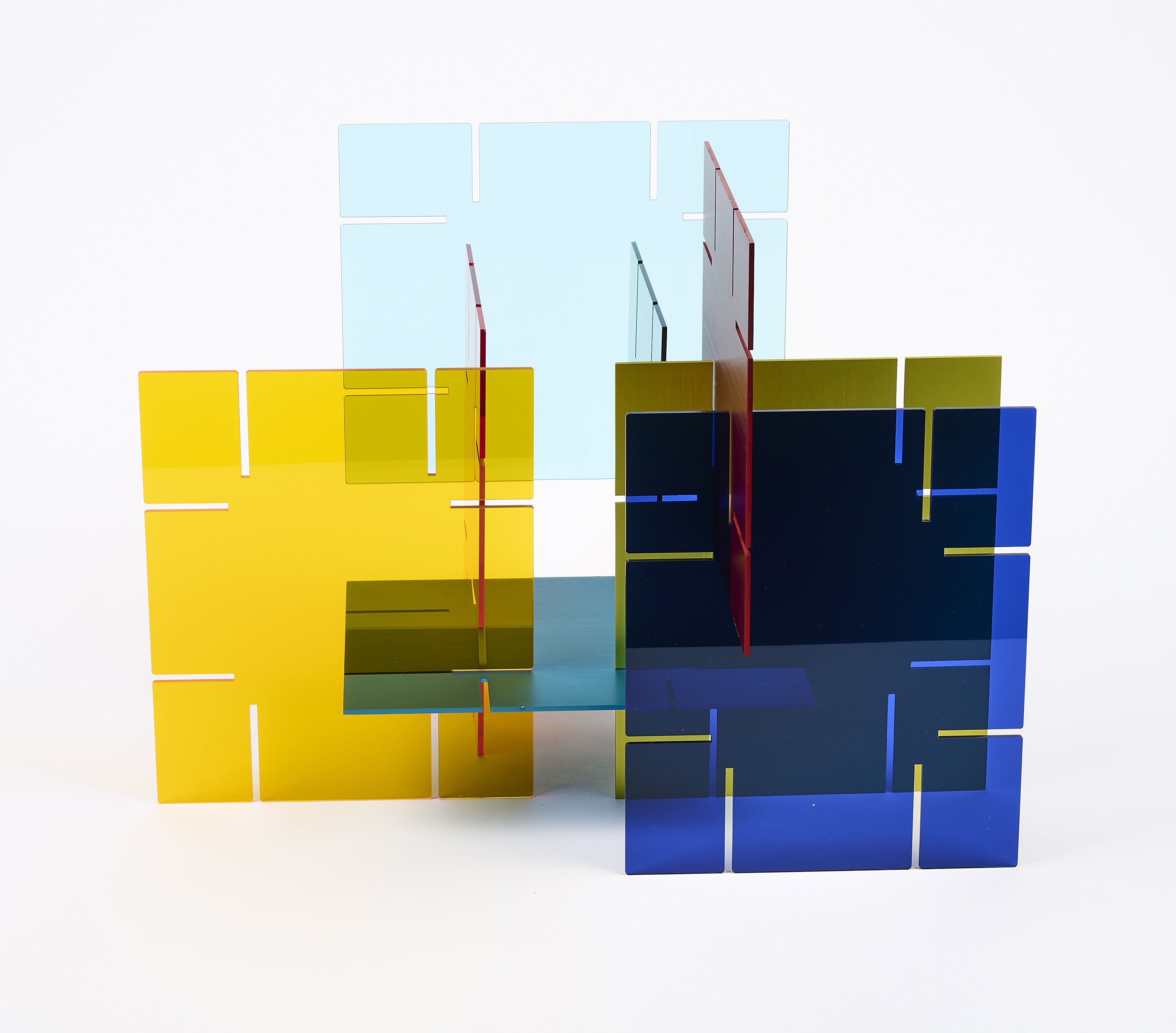 Technik: 5 farbige Plexiglasplatten und 3 farbige Aluminiumplatten, variabel zusammensteckbar.