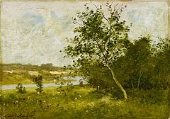 Französische Flusslandschaft. Signiert unten links: Léon Richet. Öl auf Papier. Auf Karton kaschiert. 25,5 x 36cm. Rahmen.