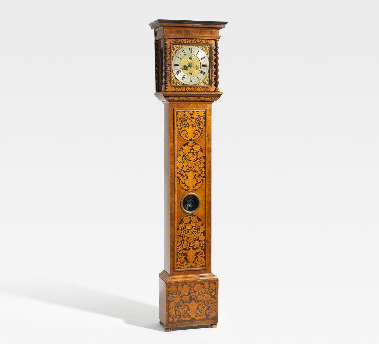 Technik: Nussbaum poliert, florale Einlagen. Vergoldetes Zifferblatt.
