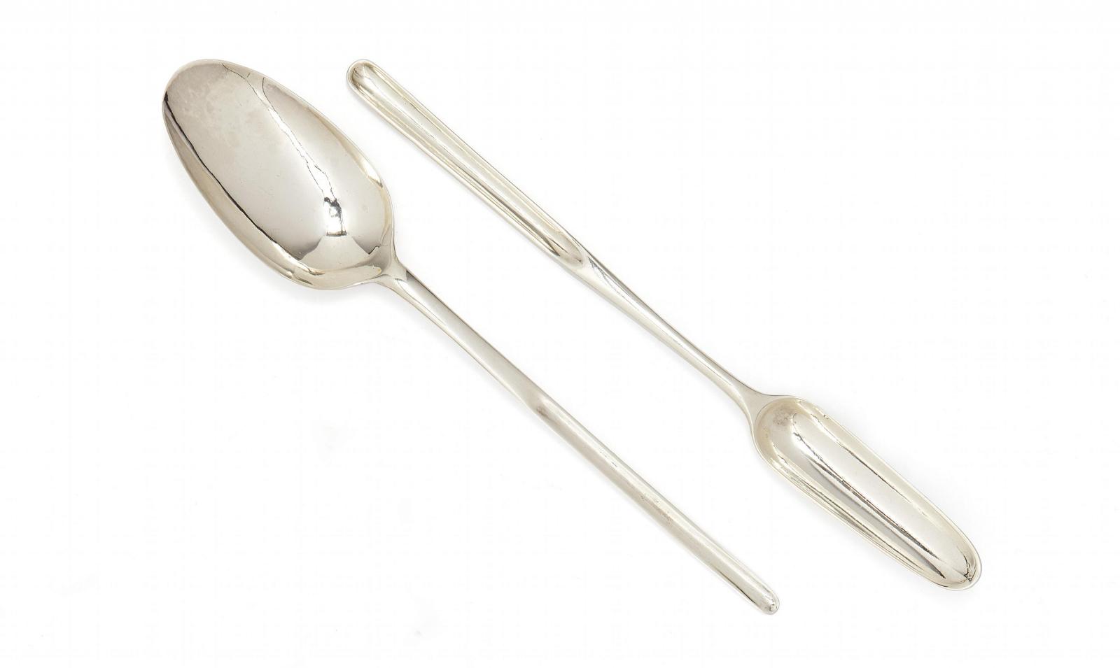 a) BZ London 1768-69, MZ wohl für Thomas & William Chawner (ab 1765, Grimwade Nr.3817). b) BZ London 1724-25, MZ James Wilks (ab 1722, ebd. Nr.1734). Zustand A.