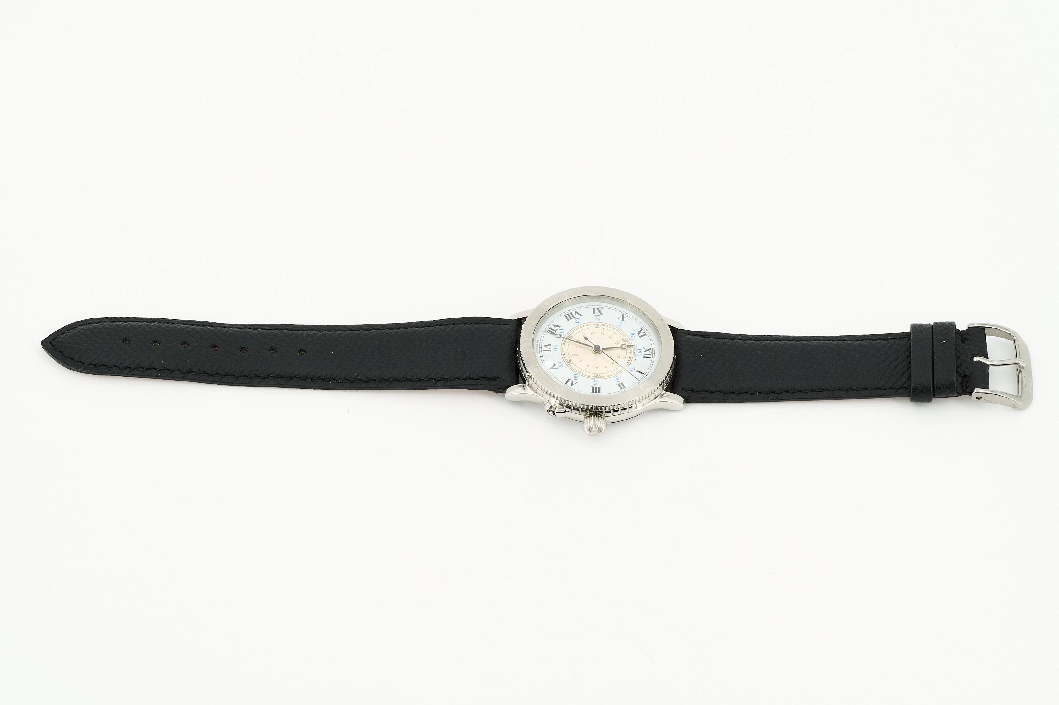 Gehäuse/Armband: Stahl, Lederarmband mit Dornschließe, Zffbl. weiß und silbern, Zeiger und römische Ziffern schwarz.