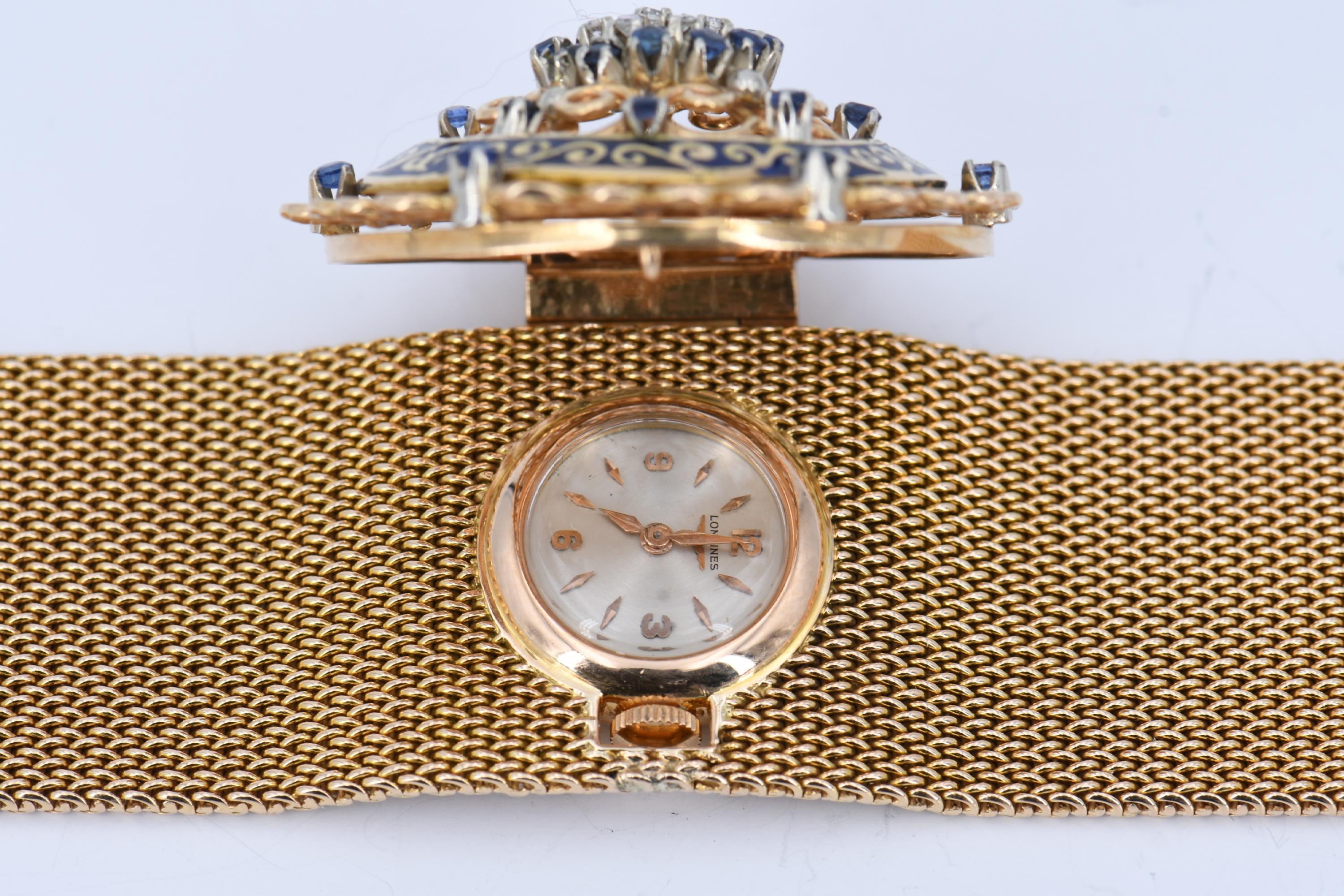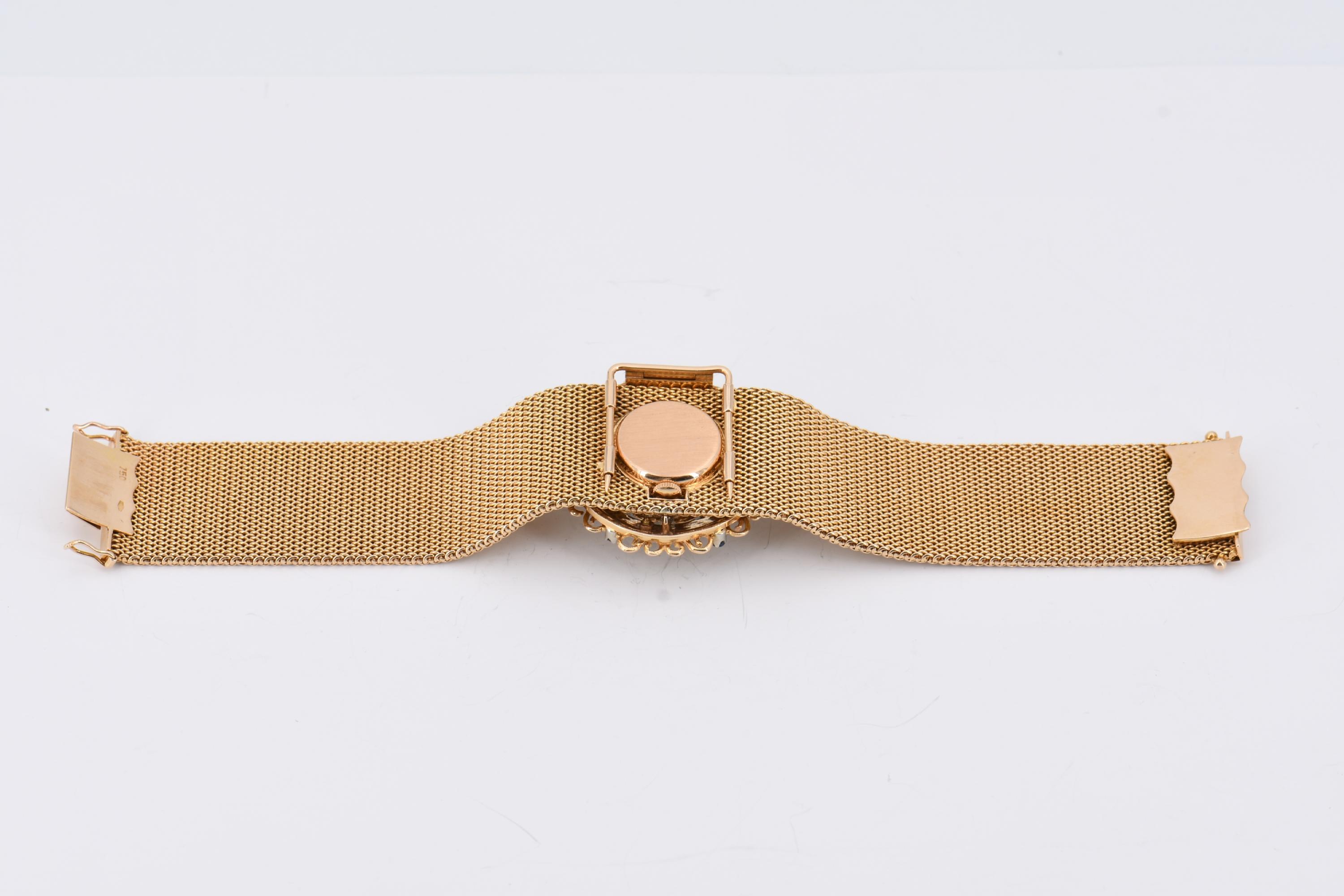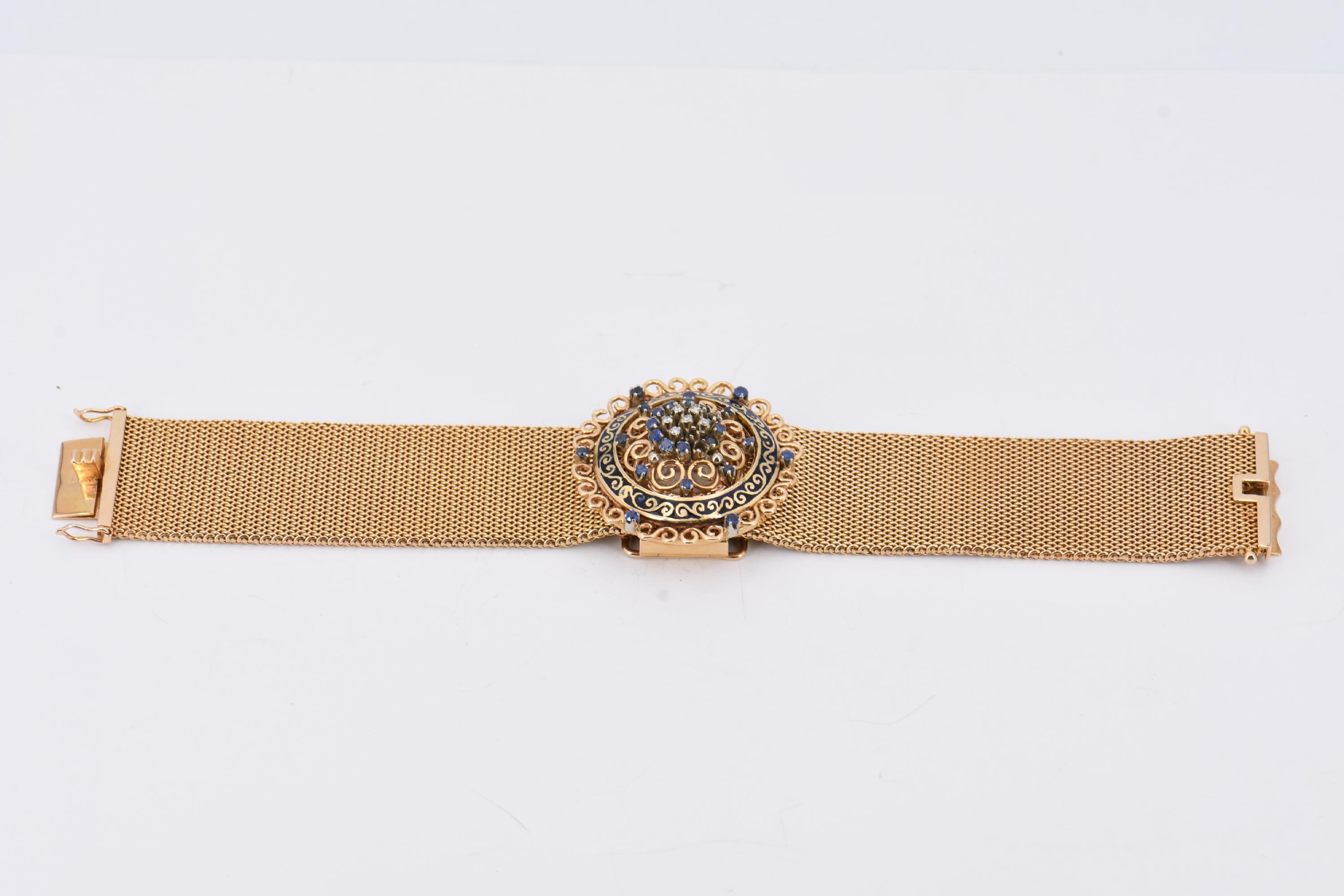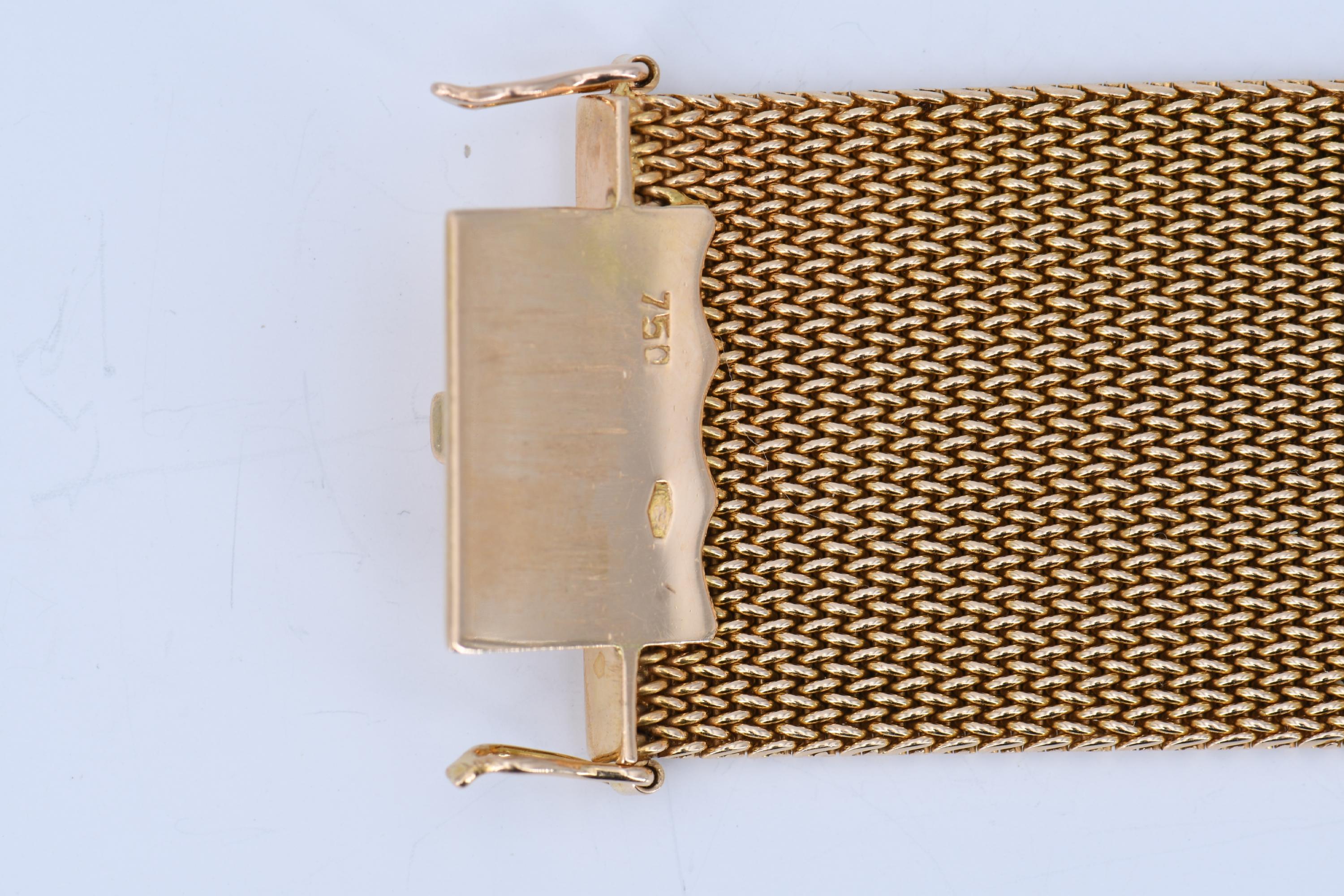 Gehäuse/Armband: 750/- Gelbgold, Teppicharmband, Klappdeckel abnehmbar, Kunststoffglas, Sicherheitsverschluss.