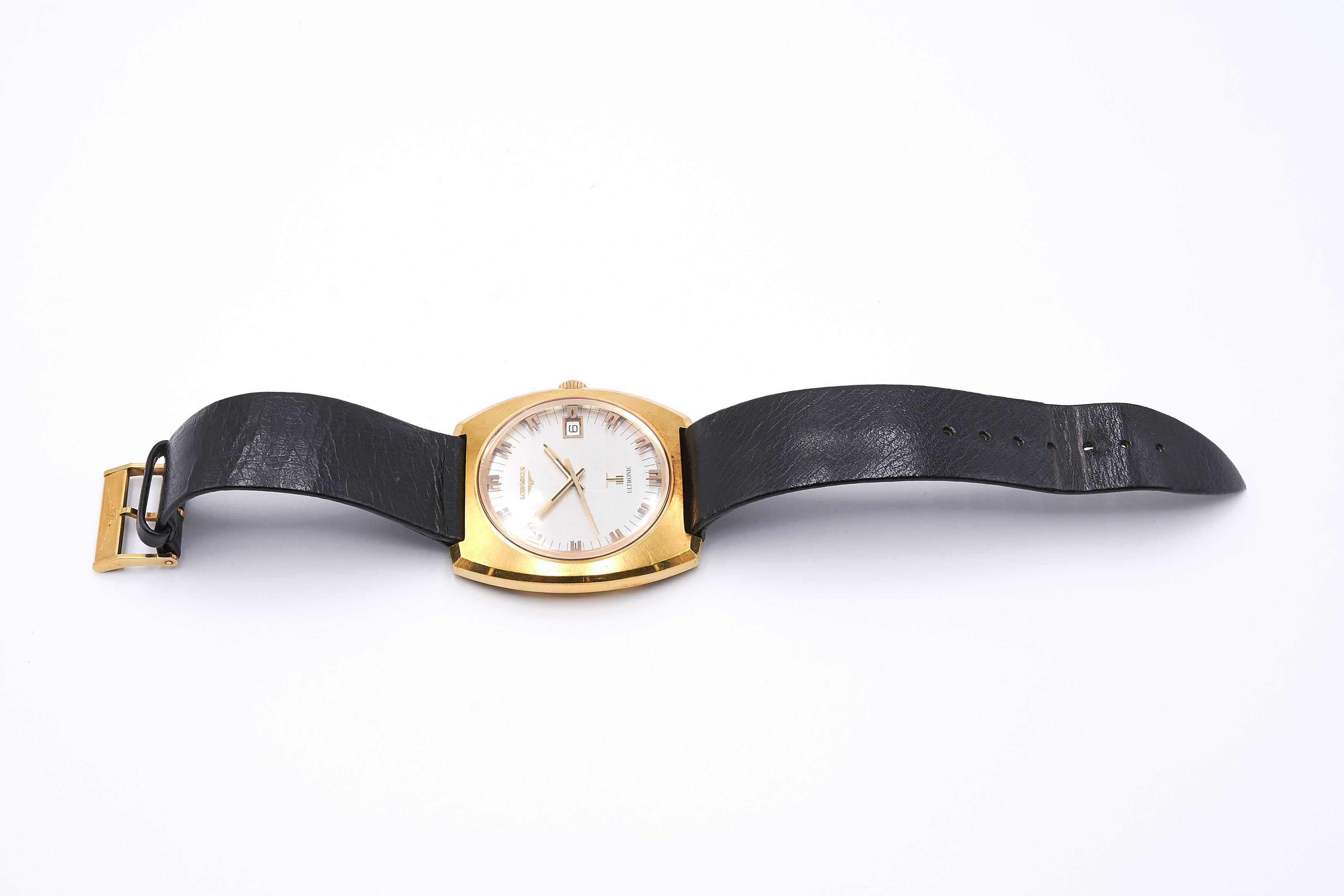 Gehäuse/Armband: Stahl und 585/- Gelbgold, Lederarmband mit orig. Dornschließe, Zffbl. silbern, Zeiger und Indizes golden.
