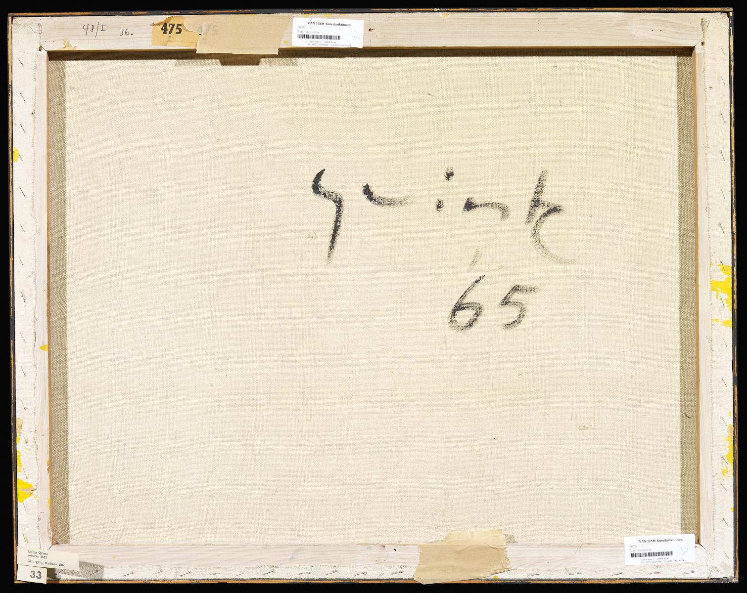 48/I 36, Gelb-Gelb-Radius. 1965. Acryl auf Leinwand. 71 x 90cm. Signiert und datiert verso auf Leinwand: Quinte '65. Auf Keilrahmen bezeichnet: 48/I 36. Atelierleiste.