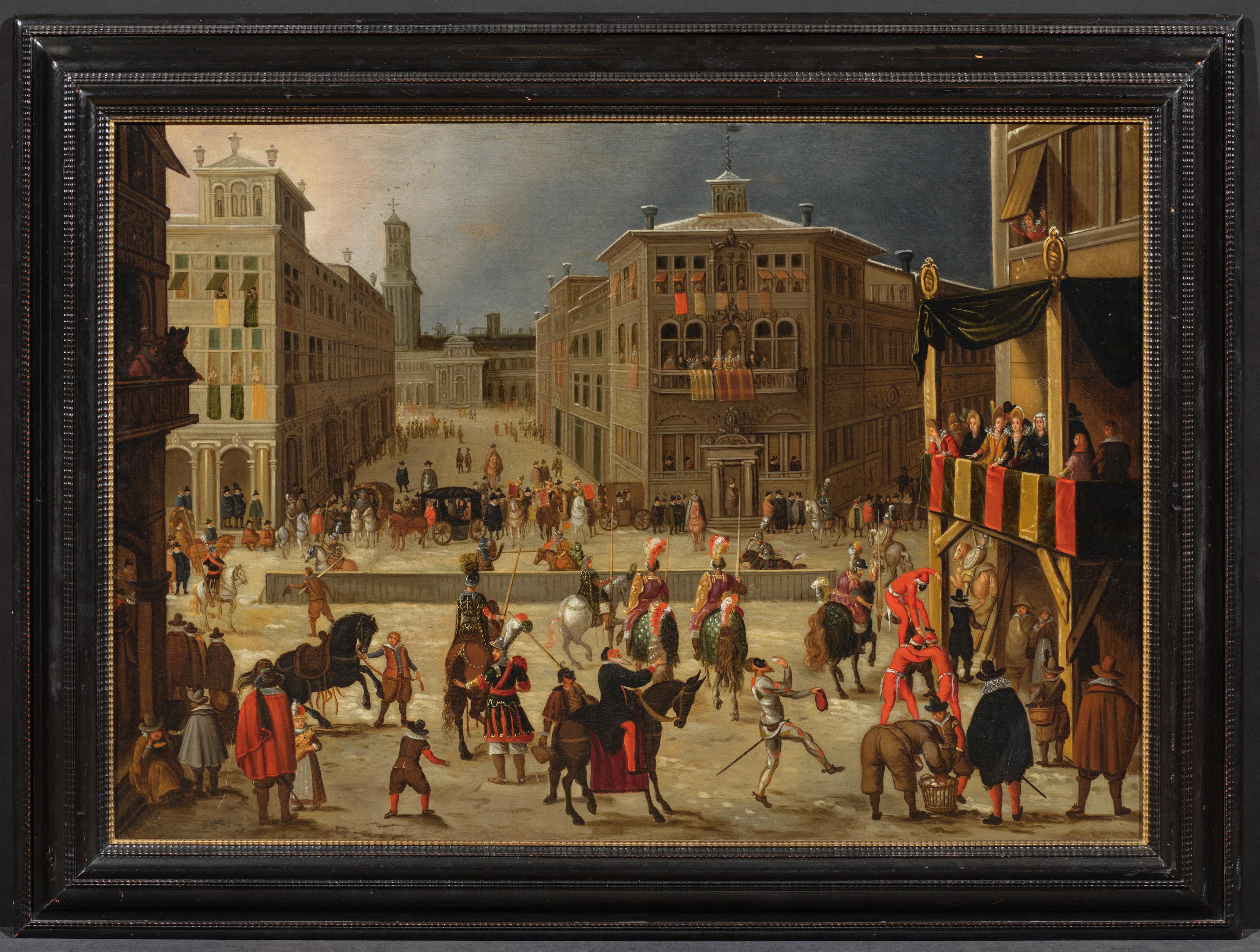 Titel: Stadtansicht mit Reiterwettkampf.