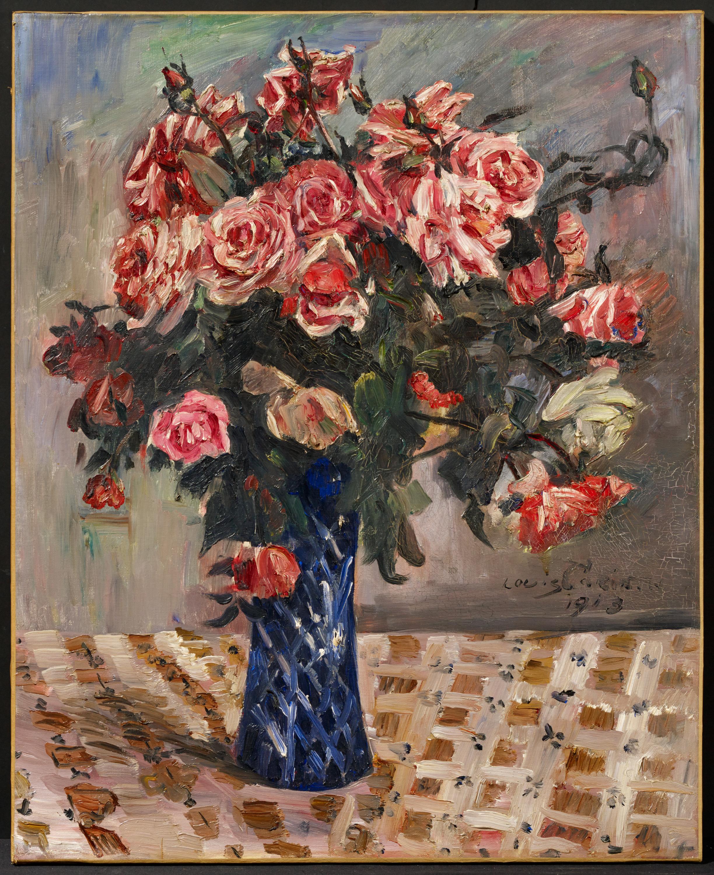 Rosenstrauß, Vase und Tischdecke - auf den ersten Blick hat Lovis Corinth in unserem Gemälde diese Protagonisten klar dargestellt. Aber der Künstler schildert weit mehr: Mit pastosen, haptischen Pinselstrichen und -flecken malt er einen lichtdurchfluteten Raum, in dem sich öffnende und schließende Blüten leuchten und schillern von Rot bis Weiß und all den dazwischenliegenden zarten Farbnuancen zeigen. Zwischen ihnen setzt er sich reckende und kreuzende Stängel mit Blättern im feinen Farbenspektrum von Dunkel- bis Silbergrün. Auf virtuose Weise löst Corinth den Rosenstrauß in vitale Farbenklängen auf. Was er hier eindringlich beschreibt ist das Wachsen und Vergehen der Natur und damit auch die Veränderlichkeit allen irdischen Lebens. Wie ein Widerhall dessen scheint er das Farbenmeer des Straußes, einem "blinden" Spiegel gleich, im hellgrauen Hintergrund schemenhaft zu wiederholen. Kontrastreich stellt Corinth den abstrahierten, organischen Formen der Blumen das geometrische Rautenmuster der geschliffenen blauen Glasvase wie auch das Karomuster der braun-rosa-farbenen Tischdecke gegenüber. Mit ihnen gibt er dem Dargestellten nicht nur kompositorischen Halt. Als unveränderbare Dinge setzt er sie als eine Konstante dem Vergänglichen entgegen.