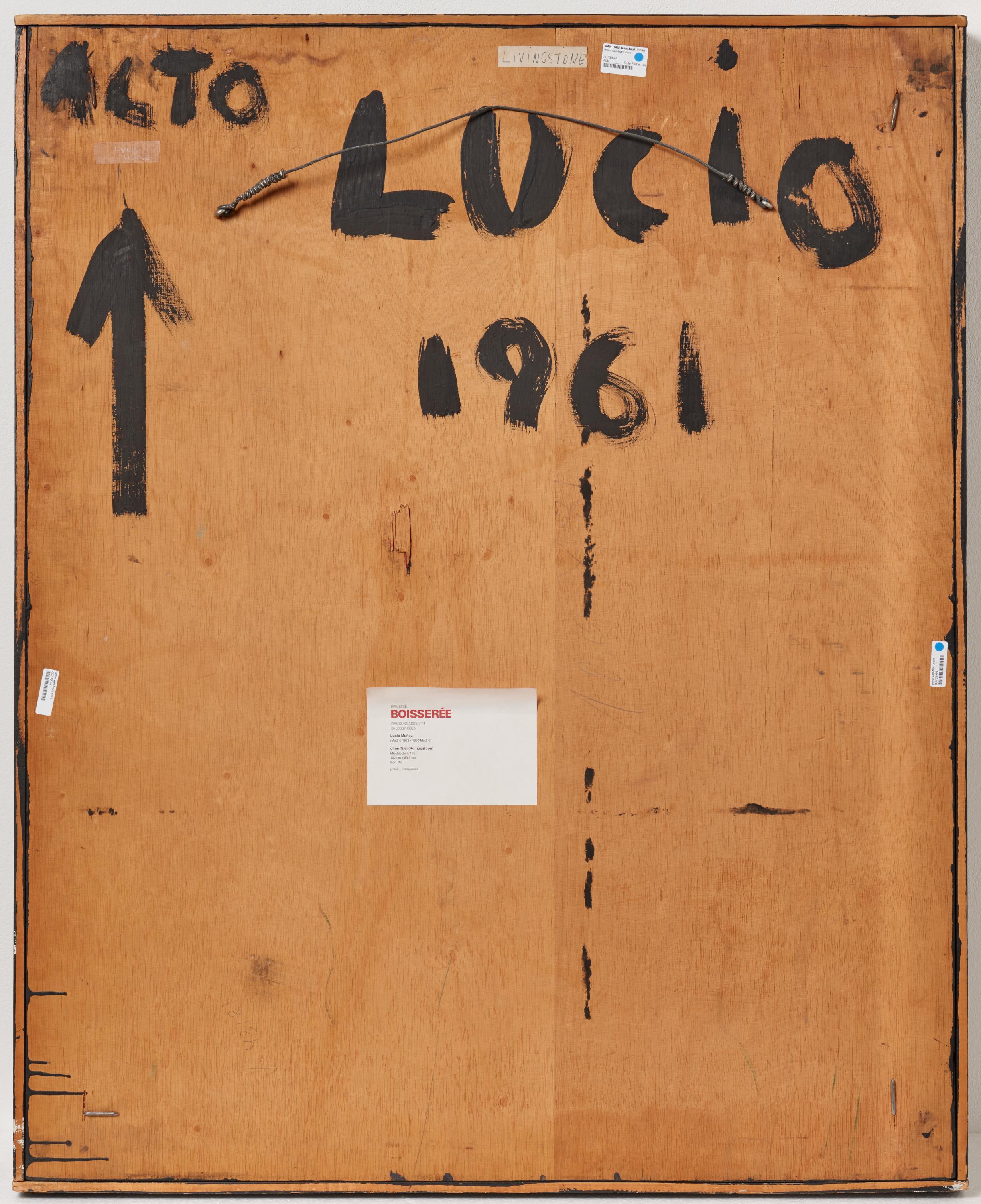 Bezeichnung: Signiert oben rechts: LUCIO. Zudem signiert und datiert verso oben: LUCIO 1961. Hier auch mit Werkangaben versehen.