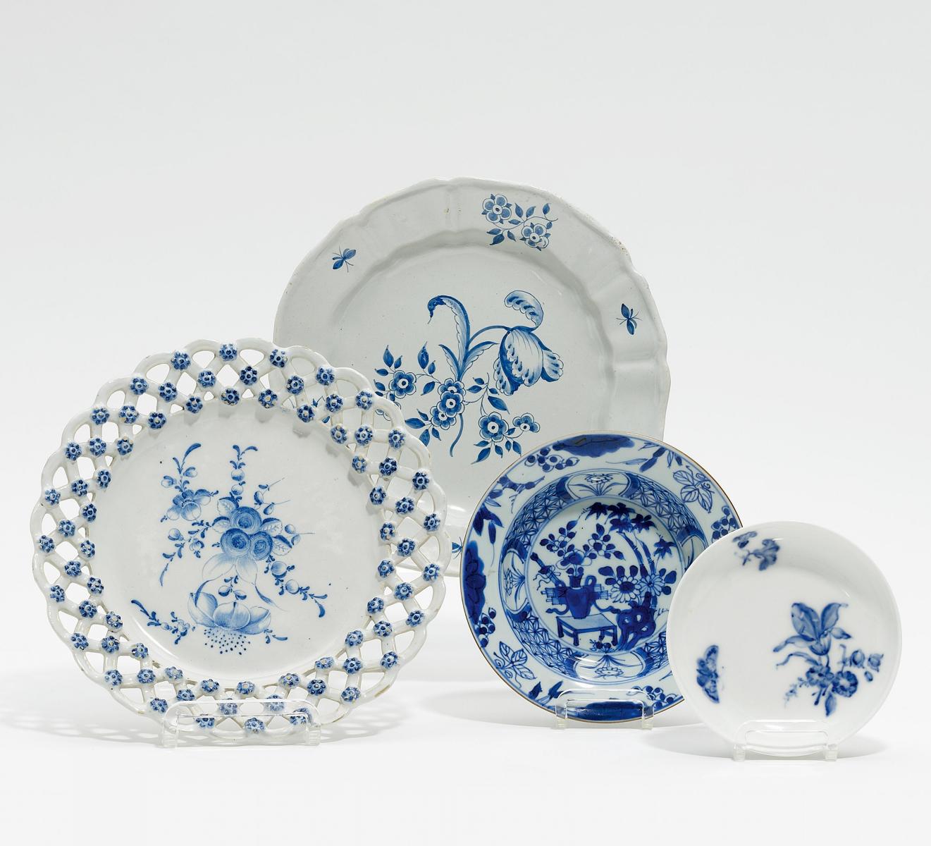 Technik: Sandfarbener und rötlicher Scherben, weiße Glasur, blaues Dekor. Zweimal Porzellan, unterglasurblaues Dekor.
