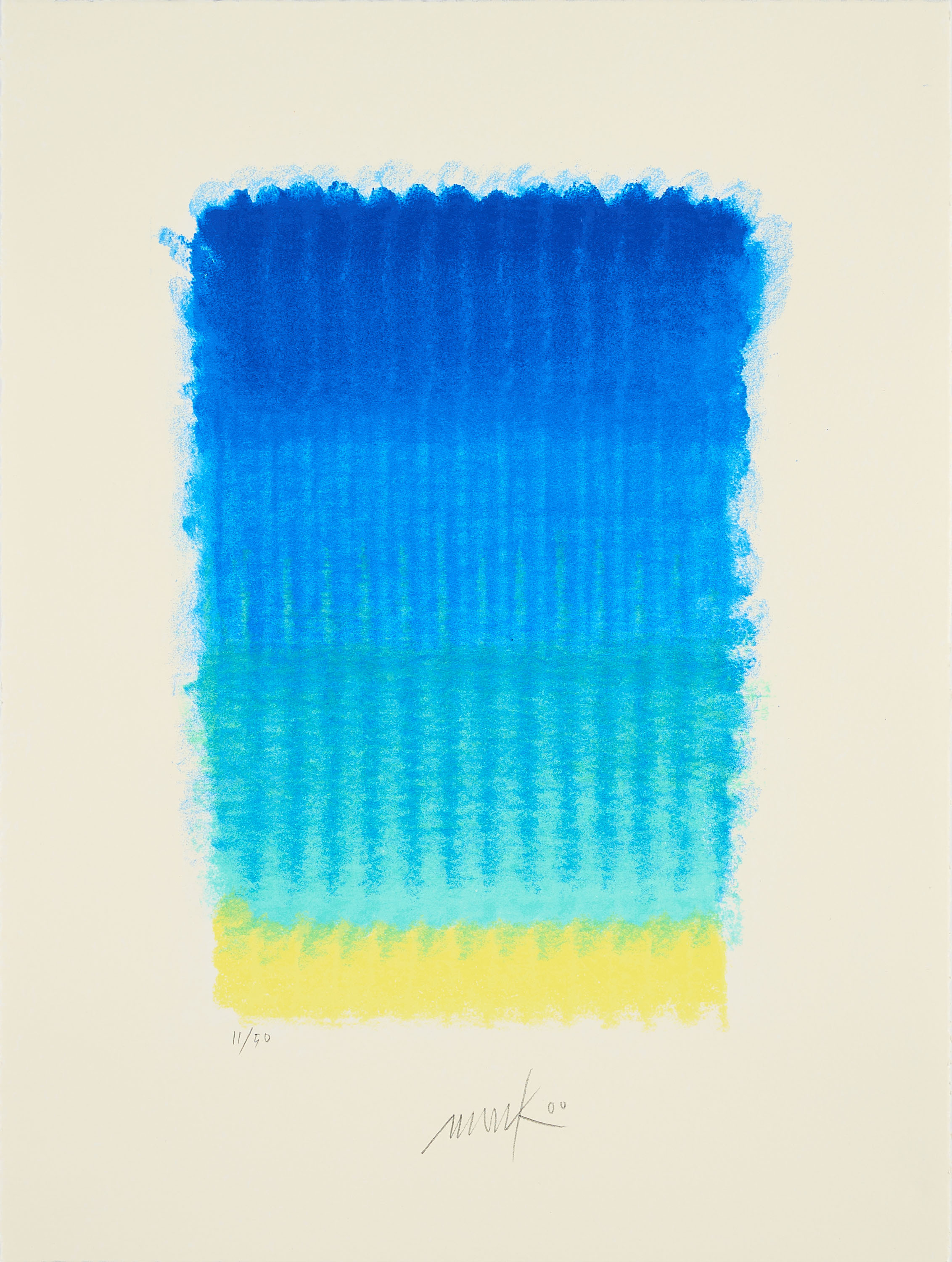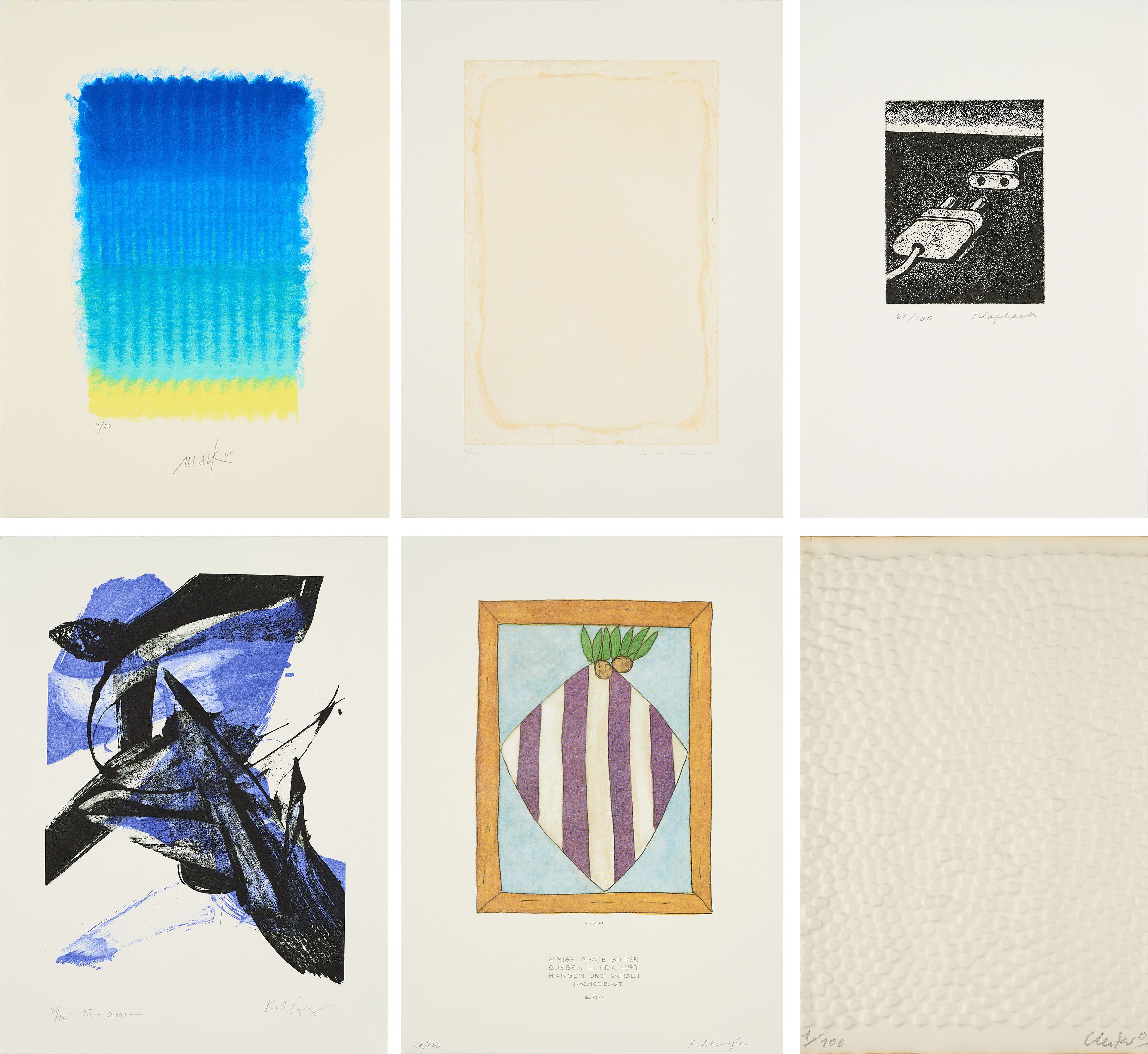 Karton. d) Raimund Girke. Farblithografie auf Bütten. e) Karl Otto Götz. Farblithografie auf Bütten. f) Gotthard Graubner. Aquatintaradierung auf Velin. g) Konrad Klapheck. Radierung auf Velin. h) Heinz Mack. Farbserigrafie auf Bütten. i) Otto Piene. Farbserigrafie auf Bütten. j) David Rabinowitch. Offsetlithografie auf BFK Rives (Wasserzeichen). k) Bernard Schultze. Farbradierung auf Bütten. l) Fritz Schwegler. Offsetlithografie auf Karton. m) Christoph Staude. Offsetlithografie auf Karton. n) Günther Uecker. Prägedruck auf Bütten. o) Max Uhlig. Radierung und Aquatinta auf Velin. Jeweils: 40 x 30cm, außer g) 27,5 x 19cm. Jeweils signiert und nummeriert, teilweise betitelt und datiert oder gewidmet. Mappe: 43 x 30,5 x 1,5cm. Ex. 61/100.