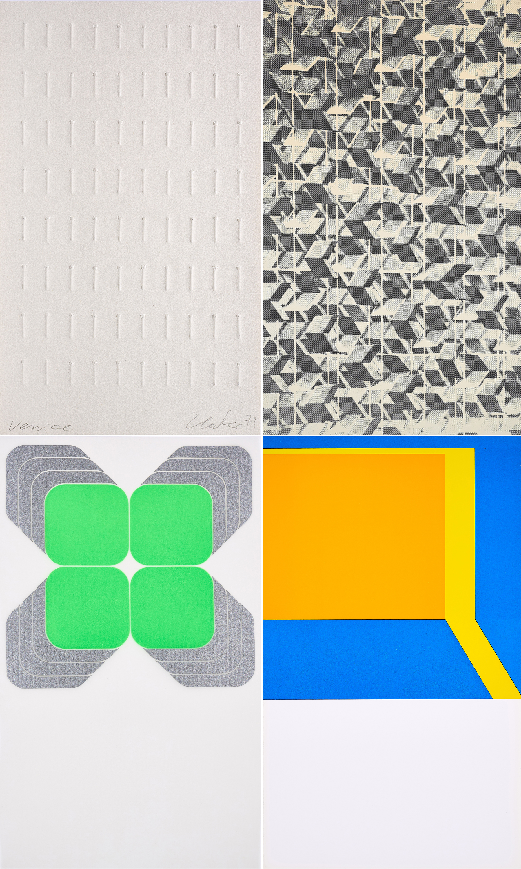 Uecker minimal abgeflacht und minimal verschmutzt an den erhabenen Stellen. Uecker-Katalog minimal gebräunt an den Kanten. Lenk mit einer minimalen Knickspur. Lenk-Katalog mit vereinzelten, minimalen Bereibungen. Mack minimal berieben an den Kanten. Verso leichtes Durchschlagen der Druckfarbe. Mack-Katalog mit vereinzelten Kratzspuren. Pfahler mit vereinzelten, minimalen Bereibungen. Pfahler-Katalog mit vereinzelten, minimalen Griffspuren. Umschlag minimal gebräunt an den Kanten und mit minimalen bis leichten Kratzspuren. Ansonsten alles in sehr gutem Zustand.