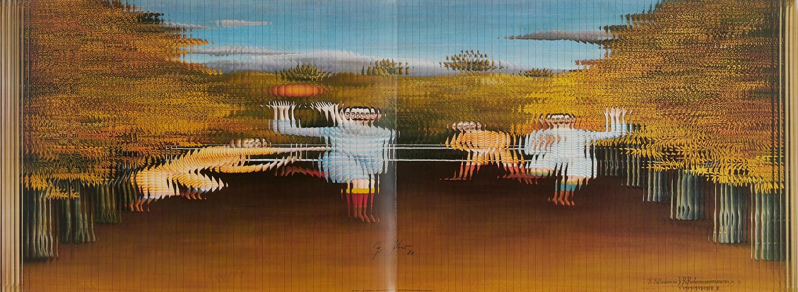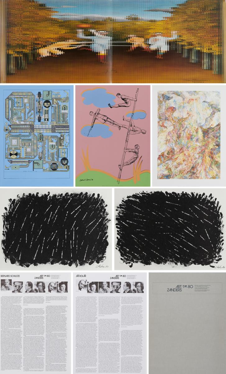 Art Zanders '80. 1980. Mappe mit je einer Druckgraphik von Christo, Kolar, Paolozzi, Schultze, Spoerri und Uecker. Verschiedene Techniken auf leichtem Karton. Jeweils: 69 x 49,6cm (Kolar 49,5 x 134cm). Signiert, Paolozzi Drucksignaturen. Zander Feinpapier AG, Bergisch Gladbach (Hrsg.).