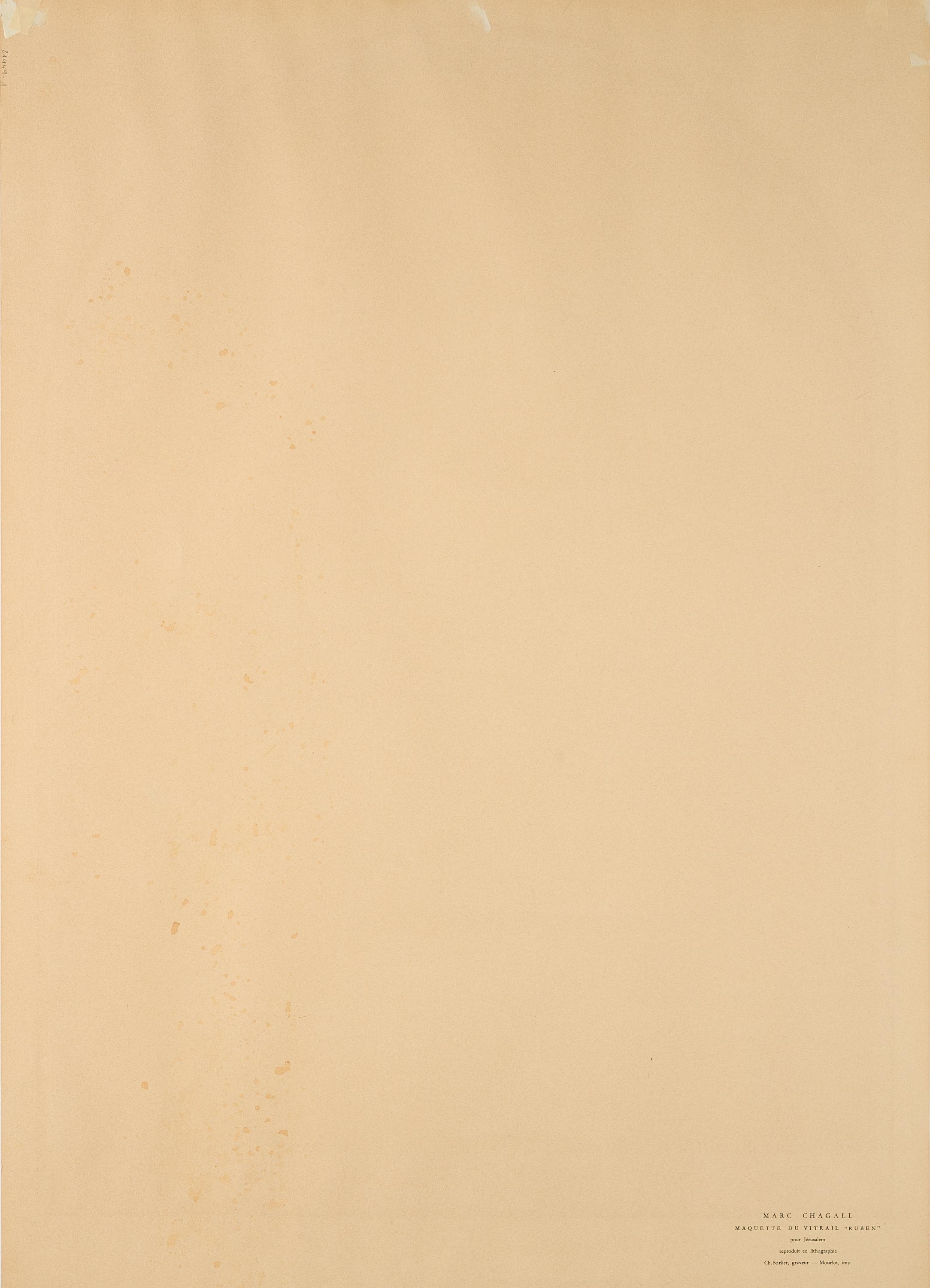 Verso mit dem typografischen Vermerk: "MARC CHAGALL MAQUETTE DU VITRAIL 'RUBEN' pour Jérusalem reproduit en lithografie Ch. Sorlier, graveur - Mourlot, imp."