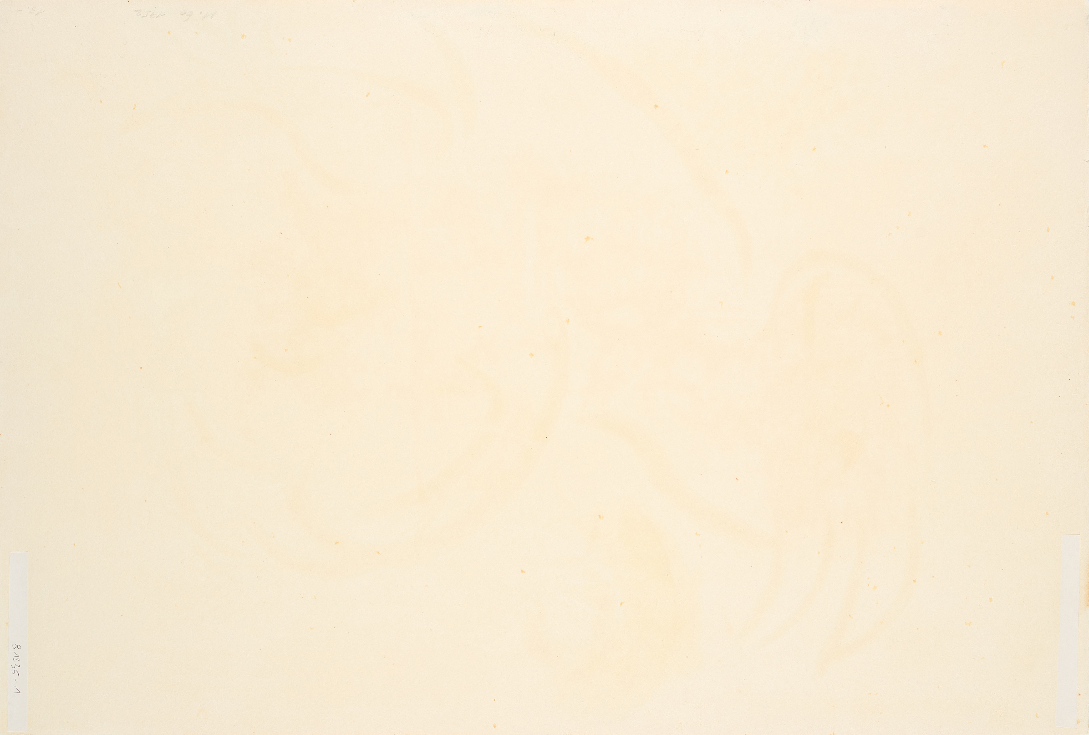 Das Rot ist verblasst und ähnelt eher einem Violettton. Leicht und unregelmäßig gebräunt. Vereinzelt minimale Bestoßungen an den Kanten. Verso minimal gebräunt, minimale Stockflecken und Reste alter Montierung. Ansonsten guter Zustand.