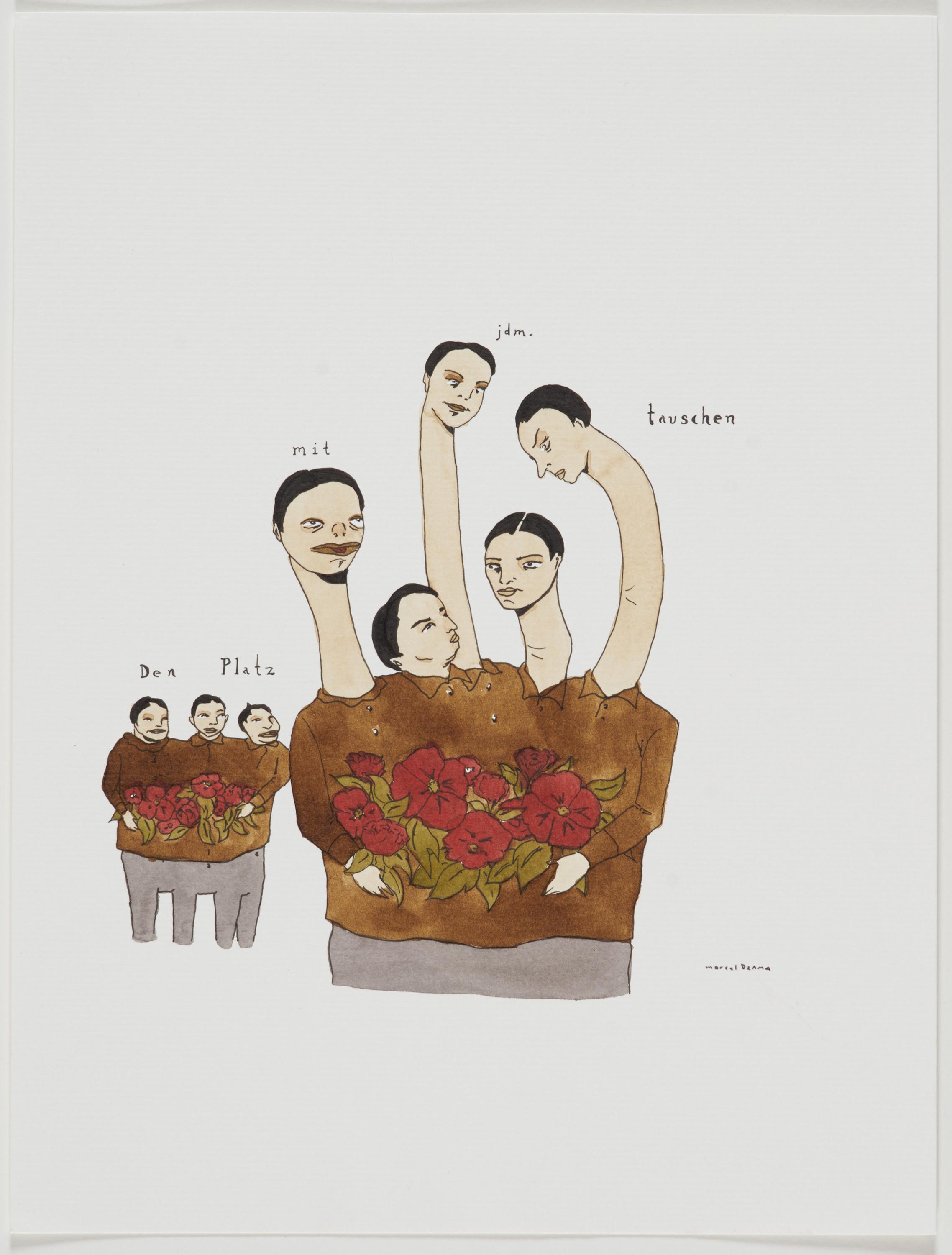 Bezeichnung: Signiert unterhalb der Darstellung rechts: Marcel Dzama. Zudem betitelt, nochmals signiert und datiert verso: To trade places with... Marcel Dzama 2000.