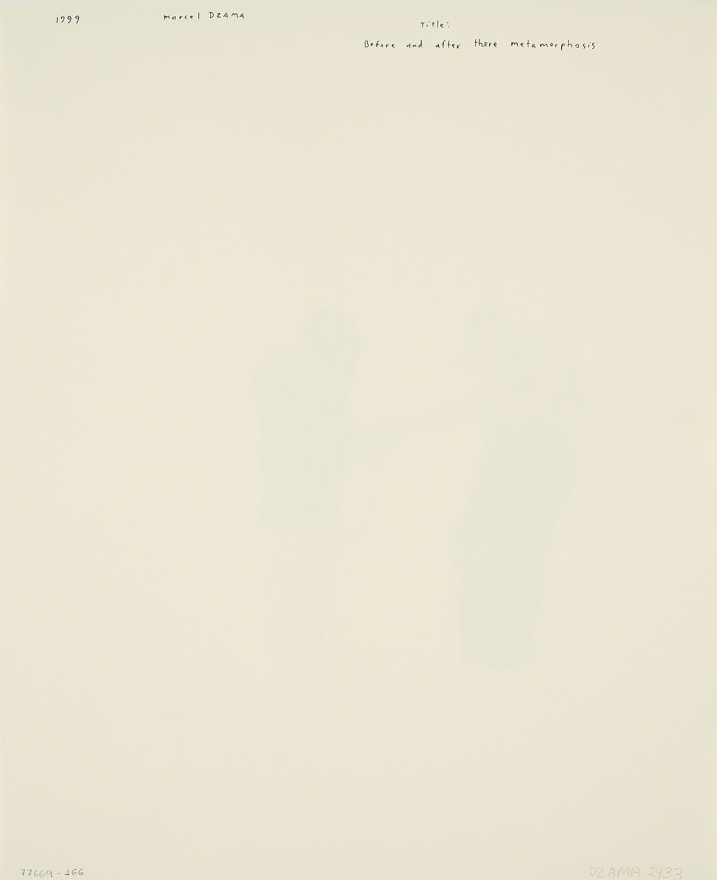 Bezeichnung: Signiert unten rechts: marcel DZAMA. Sowie datiert, signiert und betitelt verso: 1999 marcel DZAMA Title: Before and after there metamorphosis.