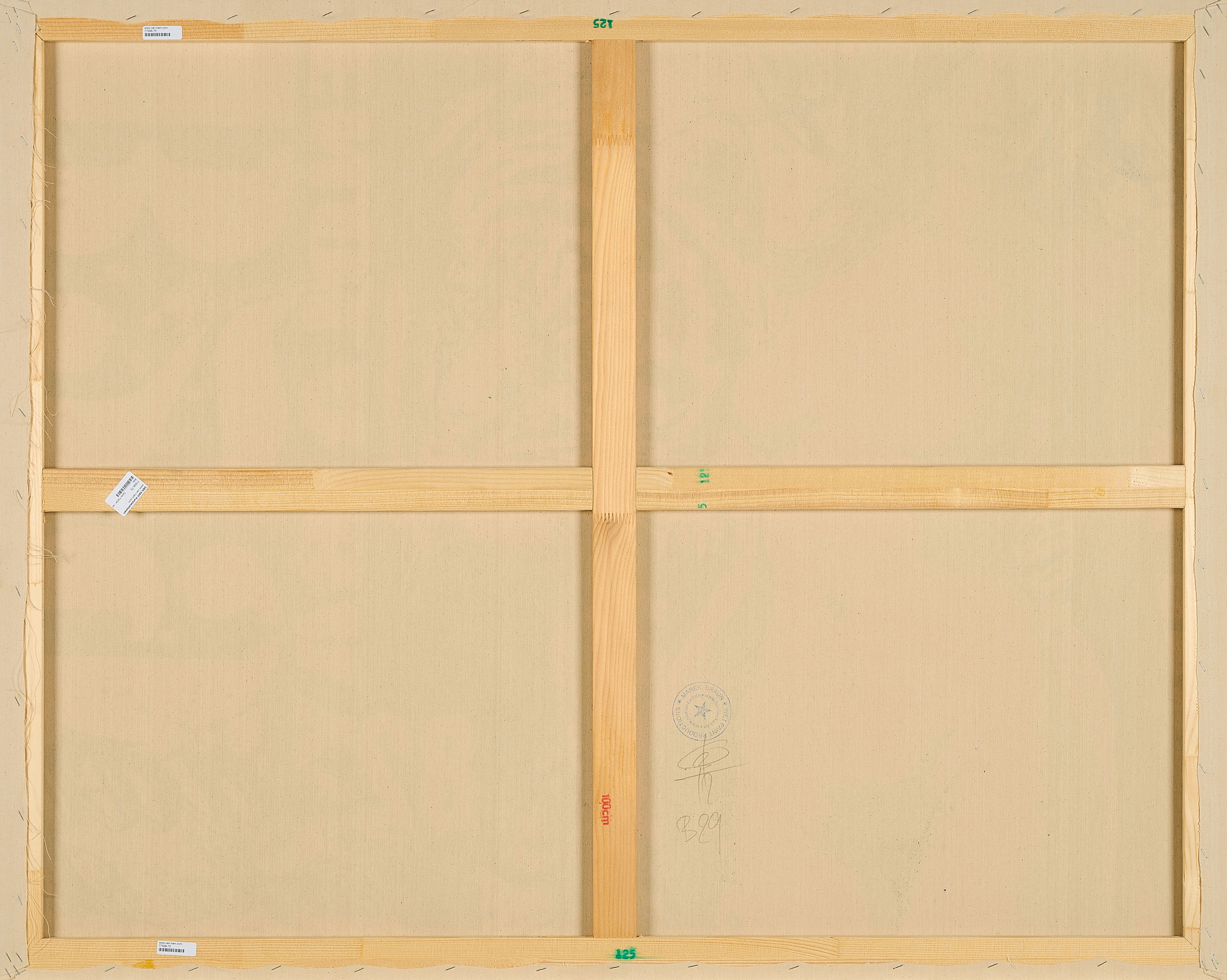 Geringe Leinwandspannung. Vereinzelt minimale Bereibungen an den Kanten. Ansonsten sehr guter Zustand.