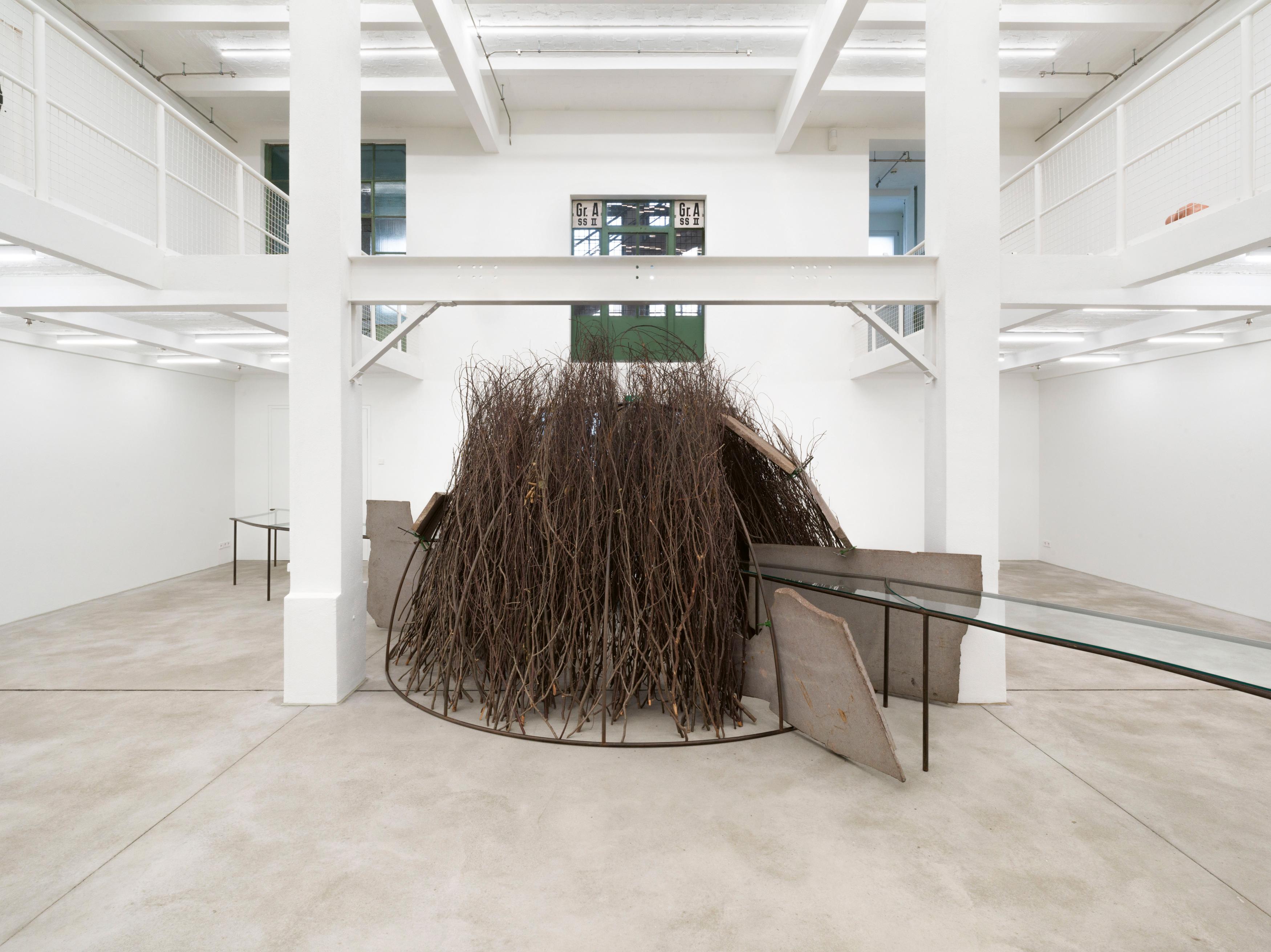 Von den Dimensionen her ist dieses Iglu durchaus komfortabel: 4 Meter Durchmesser und eine Höhe von 2,15 Metern bieten reichlich Platz. Die Wände aus Reisig schaffen einen Sichtschutz nach außen, aber das Gewölbe ist nicht wirklich bedeckt. Die Leichtigkeit der vegetabilen Reisigbündel wird kontrastiert von massiven, kompakten Steinplatten, deren Oberflächen aber geglättet sind und die in fragil wirkenden Konstruktionen entweder auf ihren schmalen Kanten stehen oder auf anderen Platten aufliegen. Den schnell gewachsenen, jungen Ästen des Reisigs wohnt aber auch eine andere zeitliche Komponente inne als den in früheren Erdzeitaltern geformten Steinen. Das Iglu hat - höchst ungewöhnlich für diese Art des Schutzraums - zwei Zugänge. In beide führt eine Konstruktion hinein, die Mutmaßungen erlaubt. Es sind gläserne, leicht geschwungene "Tische", die, an den Zugängen jeweils von Steinplatten flankiert, wie ein Band durch den Reisigbau schneiden. Die spiegelnde Oberfläche des klaren Glases lässt an Wasser denken. Eine Wasserader, die den "großen Solitärbaum" nährt? Oder strahlt das unsichtbare Innere des Iglus hier sichtbar in den Raum aus? Die Glaskonstruktionen versperren jetzt aber den Zugang zu der Reisighöhle. Um hineinzugelangen, muss der Betrachter (gedanklich) unter den Tischen entlang krabbeln - das Glas erlaubt die Benutzung des Tischs als Steg wohl nicht. Der "Albero Grande Solitario", ursprünglich 1995 für eine institutionelle Ausstellung in Prag geschaffen, will weder belehren noch etwas behaupten. Wie alle Iglus des Künstlers kann auch dieses der Ausgangspunkt für die Phantasie der Menschen sein.